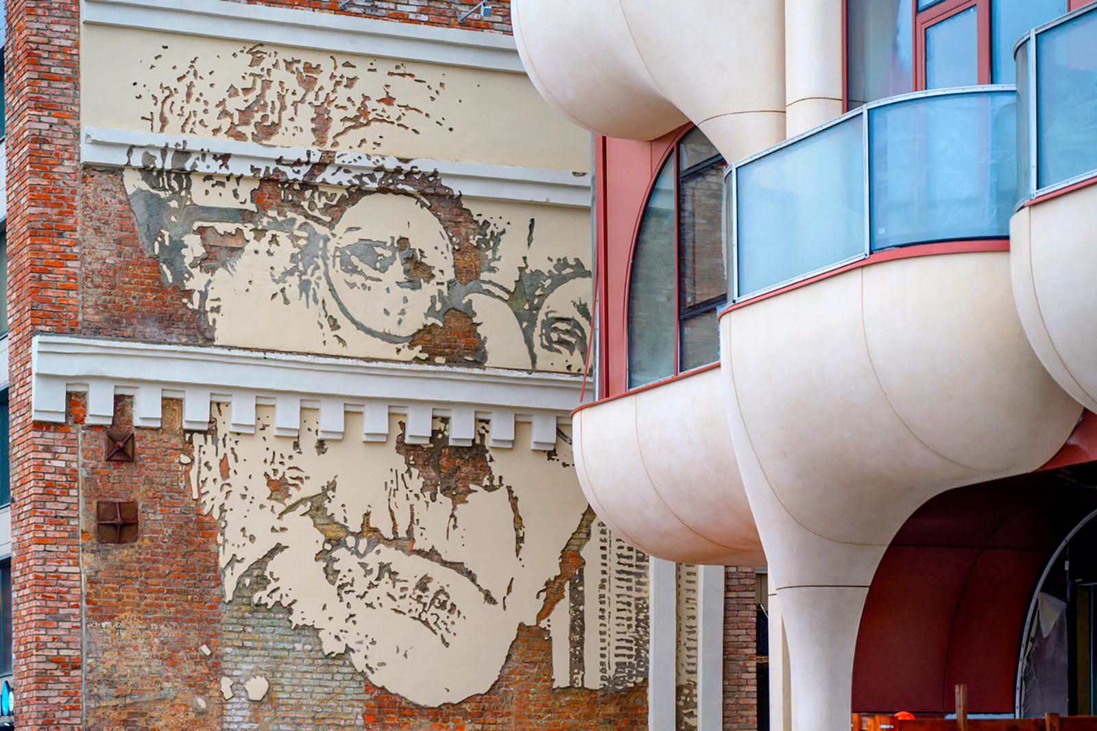 Работа португальского художника Алешандре Фарту, более известного как Vhils, появилась на фасаде общежития фабрики «Московский шелк» в 2008 году. Теперь она будет интегрирована в инфраструктуру нового жилого комплекса.