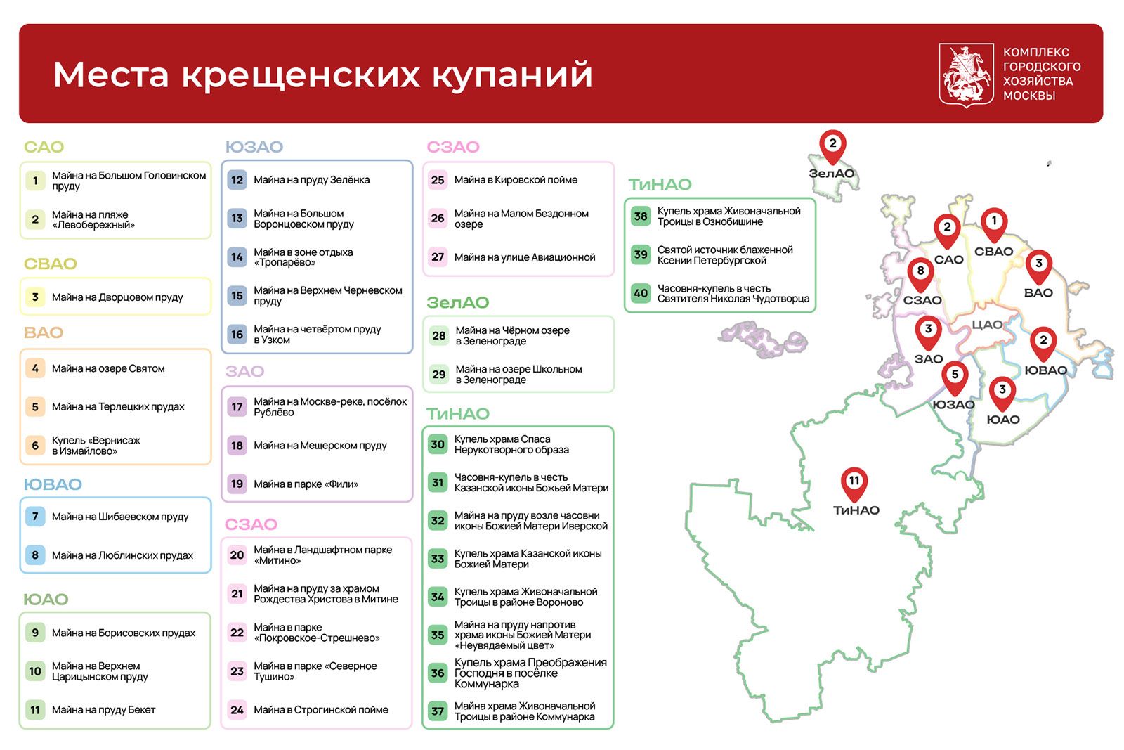 Площадки расположились во всех административных округах, кроме Центрального. Часть обустроили в московских парках. В их числе «Северное Тушино», «Серебряный бор», «Покровское-Стрешнево», «Фили», «Митино» и Воронцовский парк, природно-исторический парк «Москворецкий», а также зона отдыха «Левобережье», музей-заповедник «Царицыно» и другие локации. С полным списком адресов можно ознакомиться по ссылке (нужно выбрать тип площадки «Крещенские купели»).