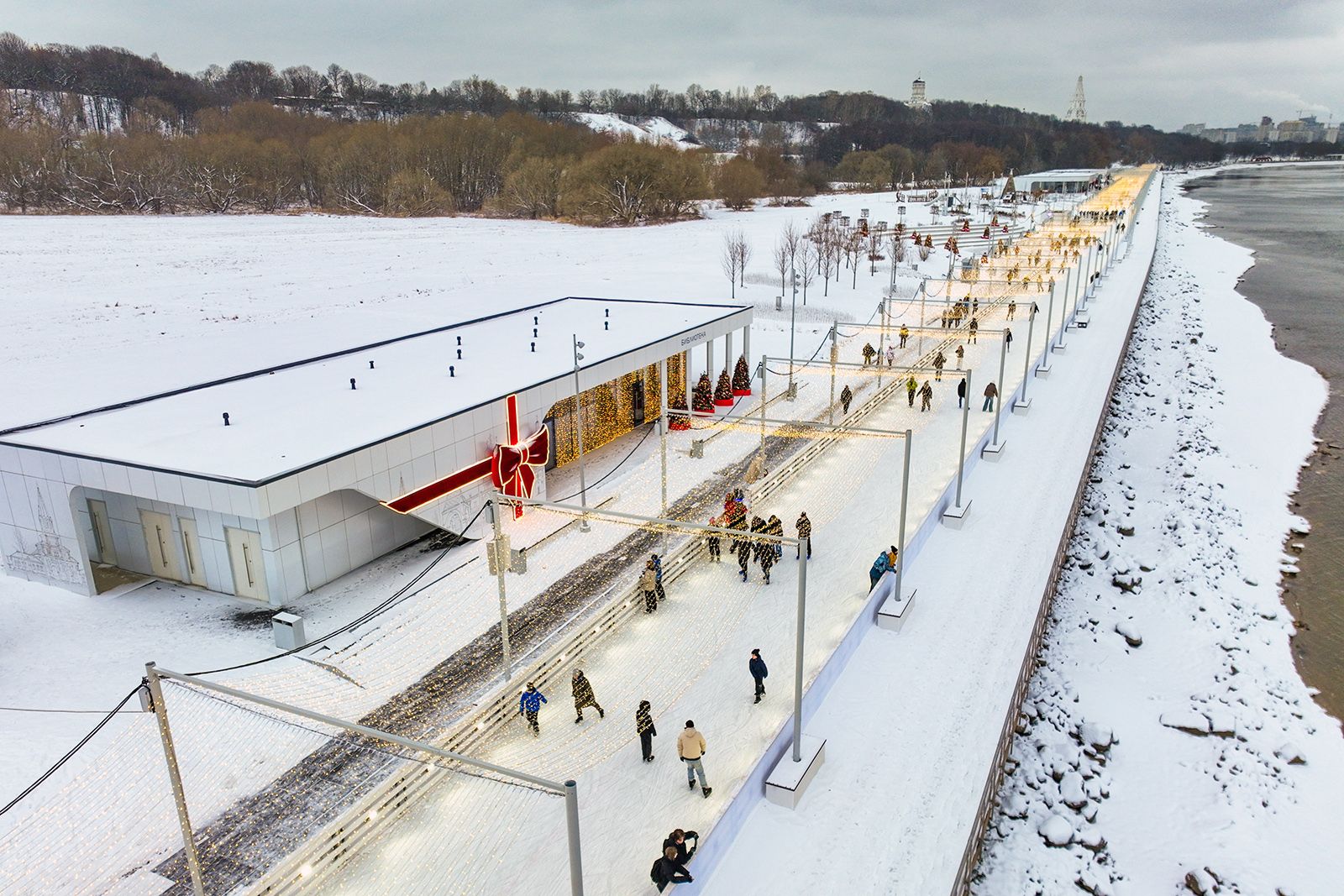 На Царской набережной в «Коломенском» открыли каток длиной 1,7 километра и площадью почти 13,5 тысячи квадратных метров со “звездным небом” из 14 миллионов светильников. Там же появилась видовая площадка с зоной для йоги, воркаут-комплексом, тренажерами и местами для отдыха с шезлонгами. Вдоль набережной обустроили различные павильоны. Пешеходную часть расширили за счет деревянного настила. Еще появилась беговая дорожка, а в южной части — спортивный кластер.