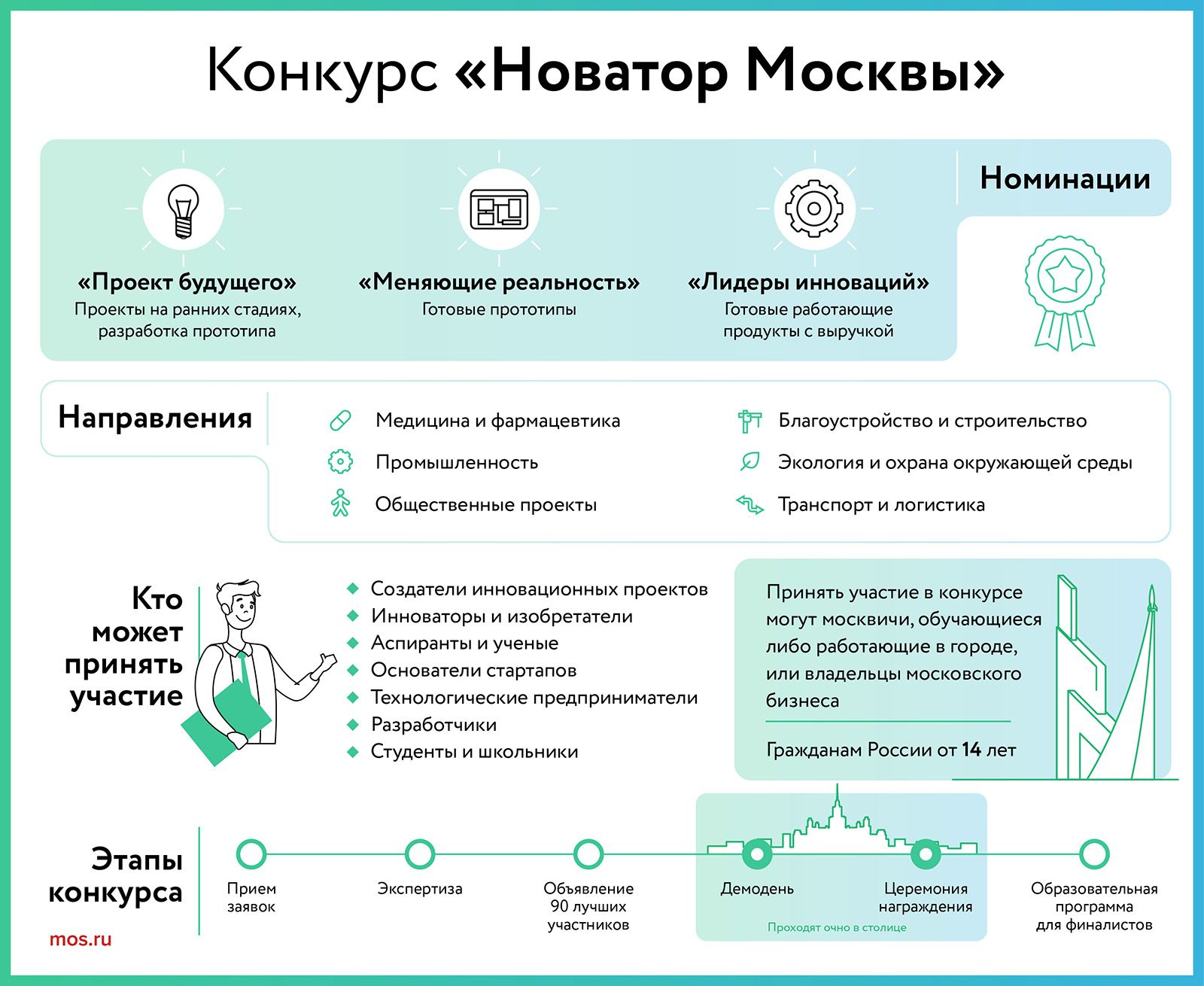 Конкурс «Новатор Москвы» направлен на создание проектов и инновационных решений для столичной инфраструктуры. Победители получают до 1,5 миллиона рублей на развитие своих разработок и возможность внедрить их в городскую среду.