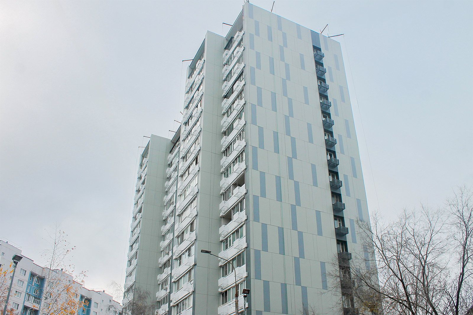 После подготовки и промывки фасада, а также ремонта межпанельных швов специалисты установили кронштейны по всей поверхности здания. Далее утеплили его плитами из минеральной ваты и смонтировали оконные обрамления. Поверх утепления установили направляющие. Затем фасад обшили панелями из фиброцемента в серых тонах.