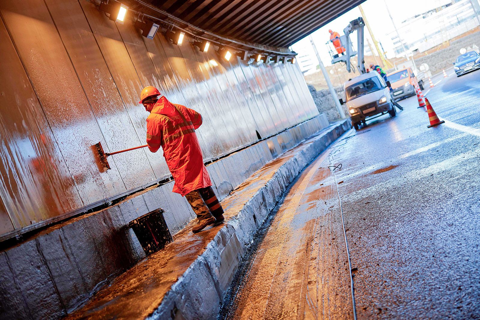 С помощью аппаратов высокого давления и специальных растворов промоют парапеты и стены инженерных сооружений, очистят дренажные системы, смотровые и сточные колодцы водосточной сети. В работе также задействуют тоннелемоечные машины со щетками для очистки стен и поливомоечную технику.