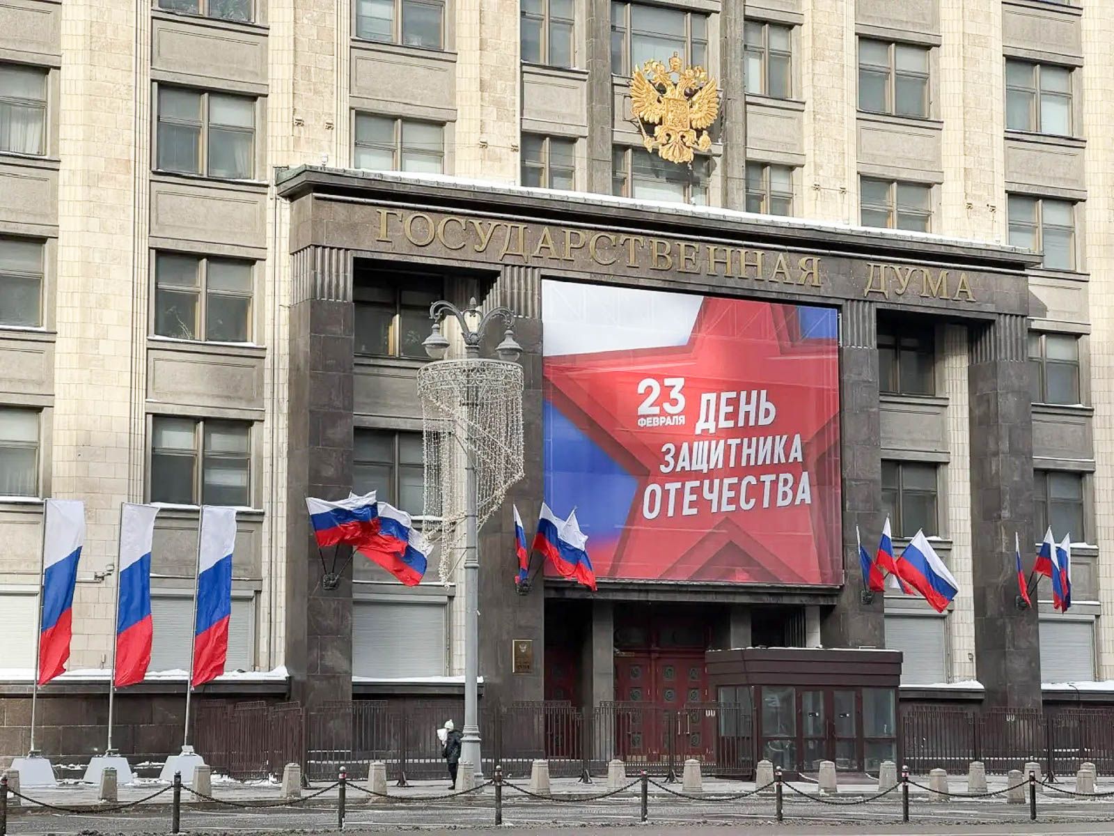 Флагами и декоративными панно традиционно украсили здания Государственной Думы на Охотном Ряду и Совета Федерации на улице Большая Дмитровка. Архитектурно-художественная подсветка зданий на центральных улицах столицы вечером 23 февраля будет работать в праздничном режиме.