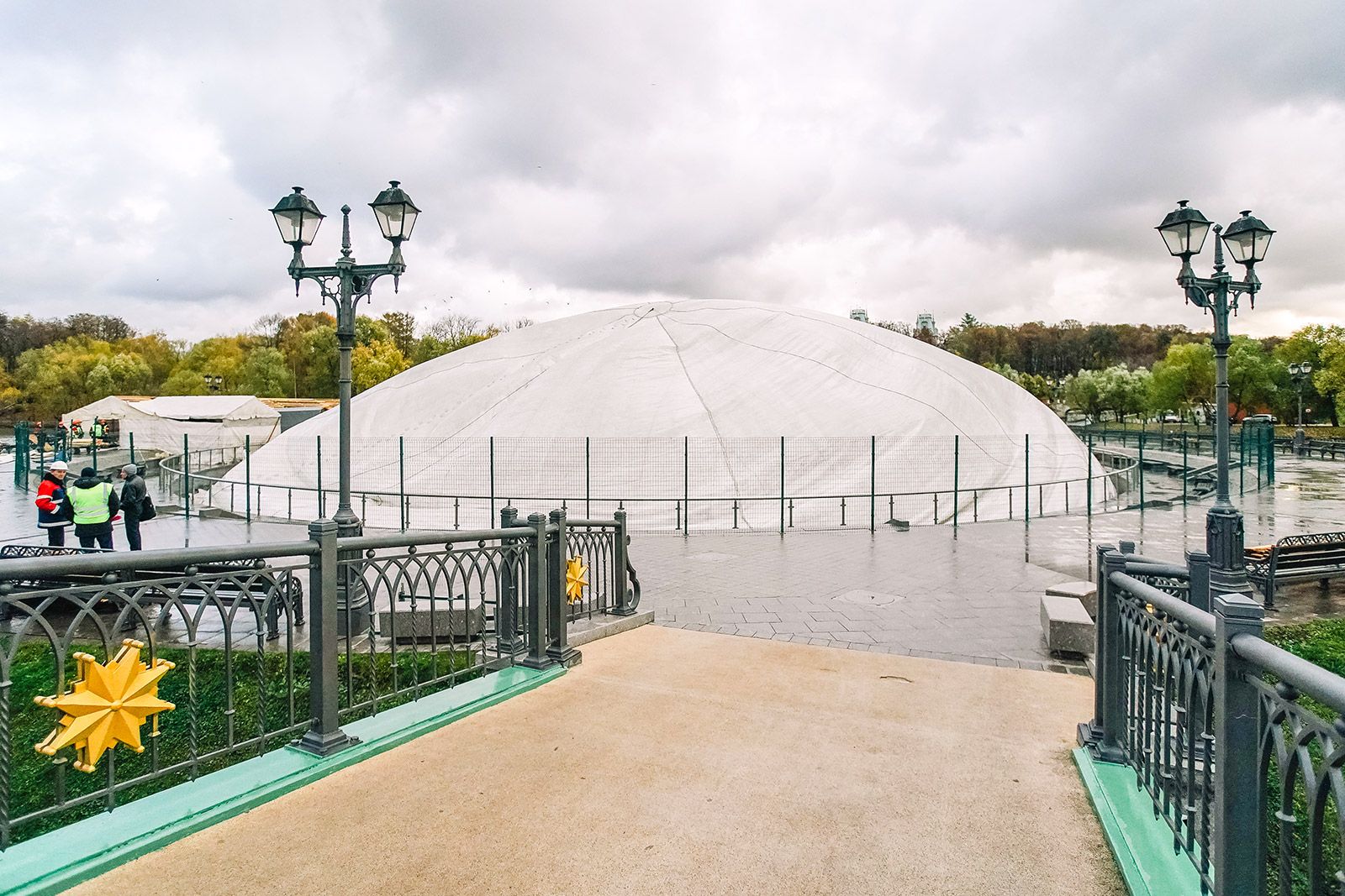 Например, на светомузыкальном фонтане в музее-заповеднике «Царицыно», который на зиму укрывается специальным воздухоопорным куполом, сотрудники дежурят круглосуточно. В непогоду они очищают купол от снега и наледи. Если допустимый слой осадков превышен, купол могут экстренно опустить и убрать все лишнее. В этом процессе участвуют до 20 человек.