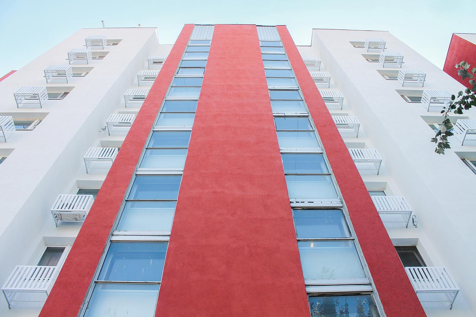 Специалисты расчистили и промыли фасады, загрунтовали, установили корзины для кондиционеров, утеплили стены минеральной ватой и оштукатурили. Для окраски дома выбрали оригинальные оттенки «сигнальный белый» и «кирпично-красный».