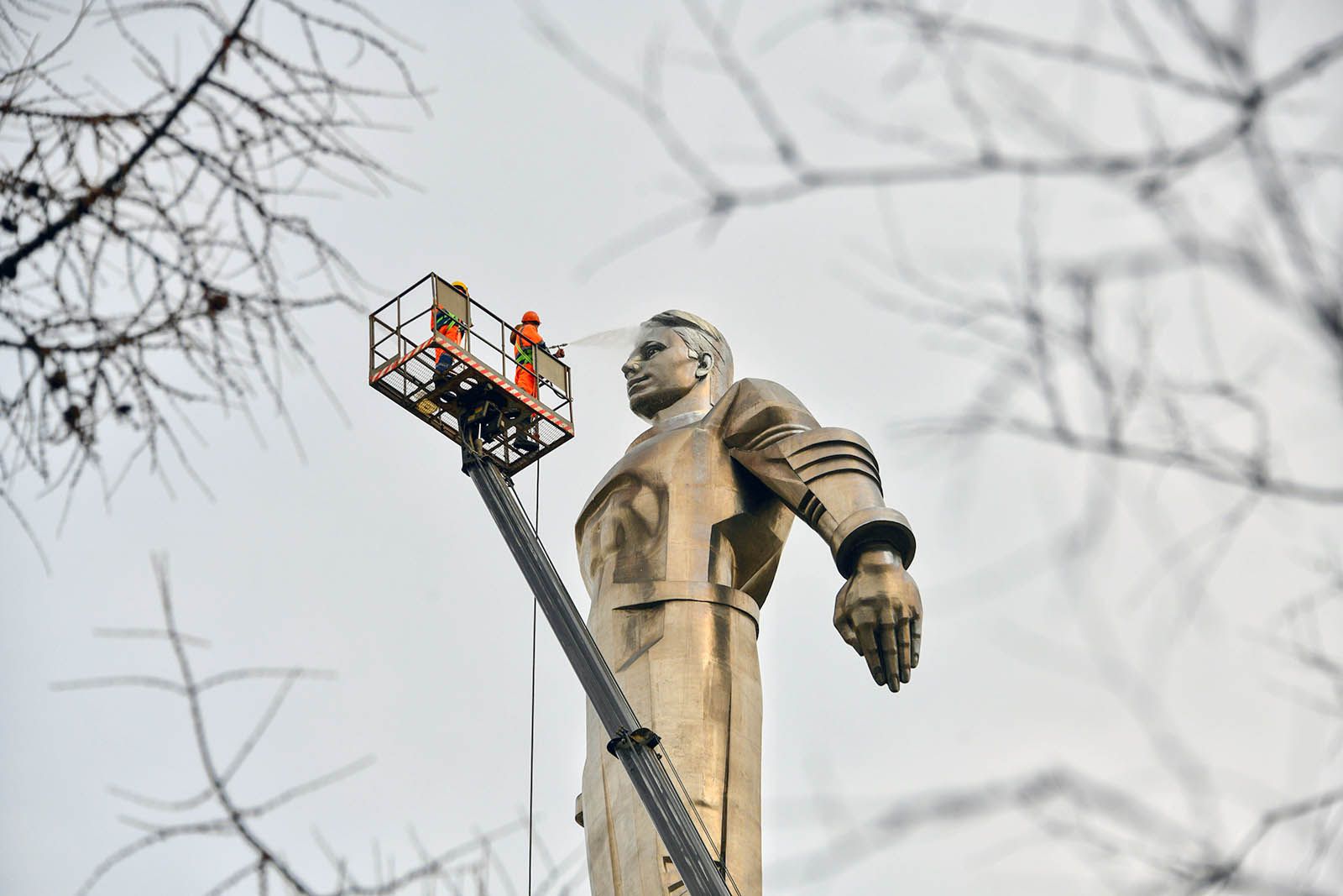 Работы на площади Гагарина выполняла бригада коммунальных служб. Они использовали автовышку высотой примерно 50 метров и моющую установку высокого давления.