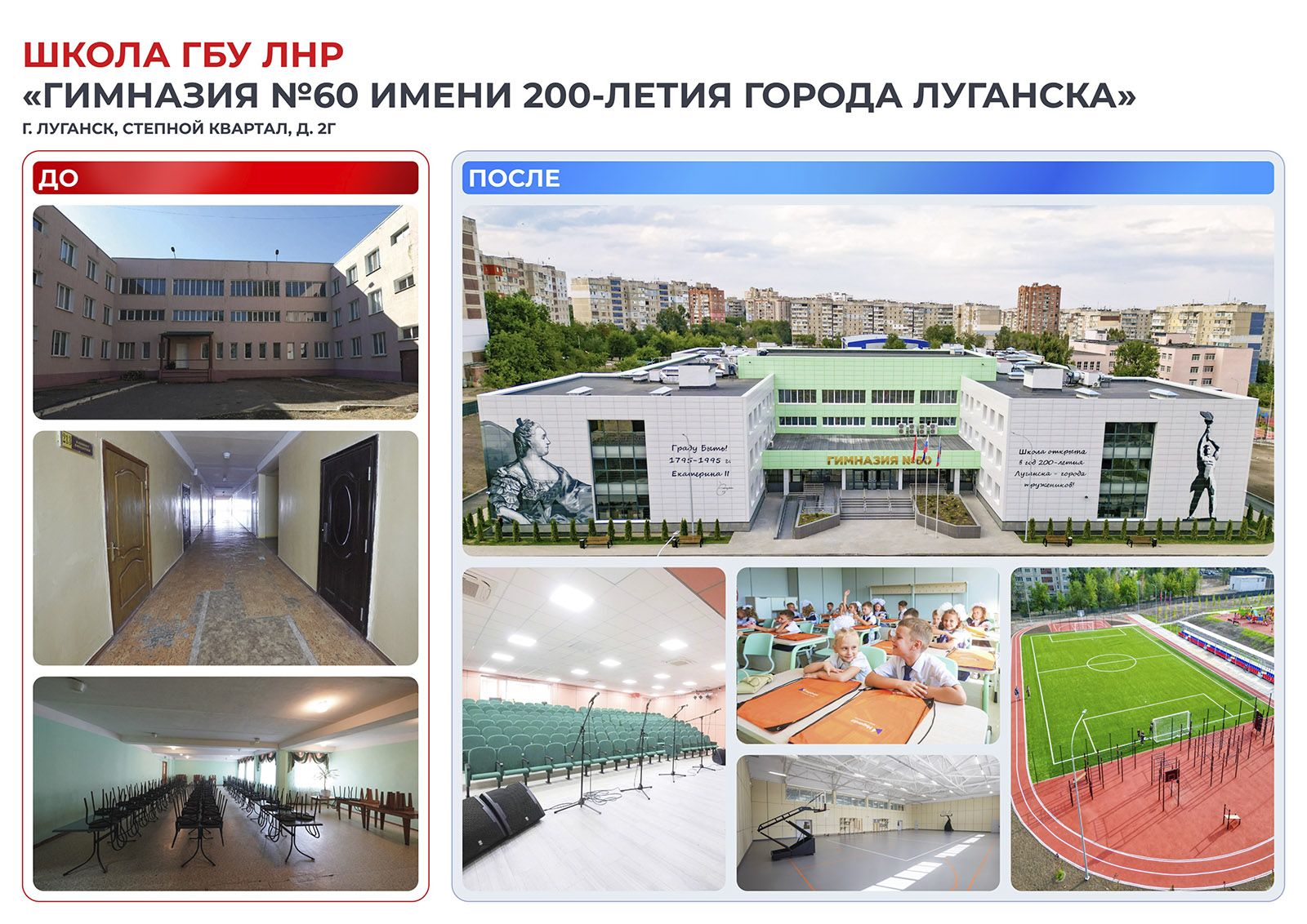 Так, ремонтные работы провели в 2491 здании и сооружении, в том числе в 275 социально значимых объектах. Среди значимых объектов 2025 года в сфере образования — ремонт здания гимназии № 60 и здания детской музыкальной школы № 2 в Луганске. В 2026 году планируется провести ремонт пяти объектов образования: школы № 9 (работы начались в 2025 году) и республиканского многопрофильного лицея-интерната «Григорьевская школа» в Донецке, а также гимназии № 52 имени М.С. Лиховида, Луганской специализированной школы № 57 имени Г.С. Петрова и Луганского учебно-воспитательного объединения «Академия детства» в Луганске.
