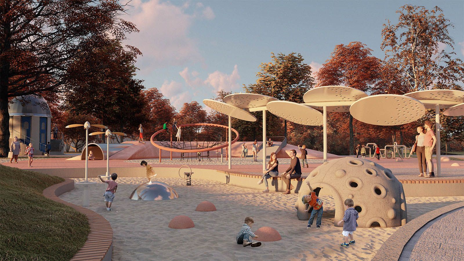 Детскую игровую зону «Звездочеты» разместят около обсерватории. Там смонтируют большой комплекс из пяти гнезд, которые расположат на разной высоте и объединят металлическими сетчатыми переходами. Рядом установят игровой элемент «Плутон» и навес с павильоном для пианино, обустроят большую песочницу.