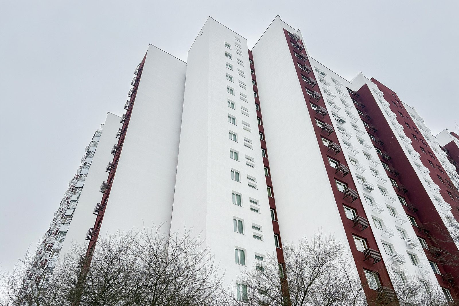 Подготовительные работы начали с расчистки и промывки открытых плоскостей. Далее нанесли грунтовку на поверхности и сделали набивку кронштейнов для кондиционеров и корзин под них. Затем установили утеплитель из минеральной ваты, оштукатурили его базовым слоем и закрепили сетки из стекловолокна. После этого фасады покрыли декоративным слоем и приступили к покраске. Из цветовой палитры выбрали оттенки «сигнальный белый» и «красный шпон макоре».