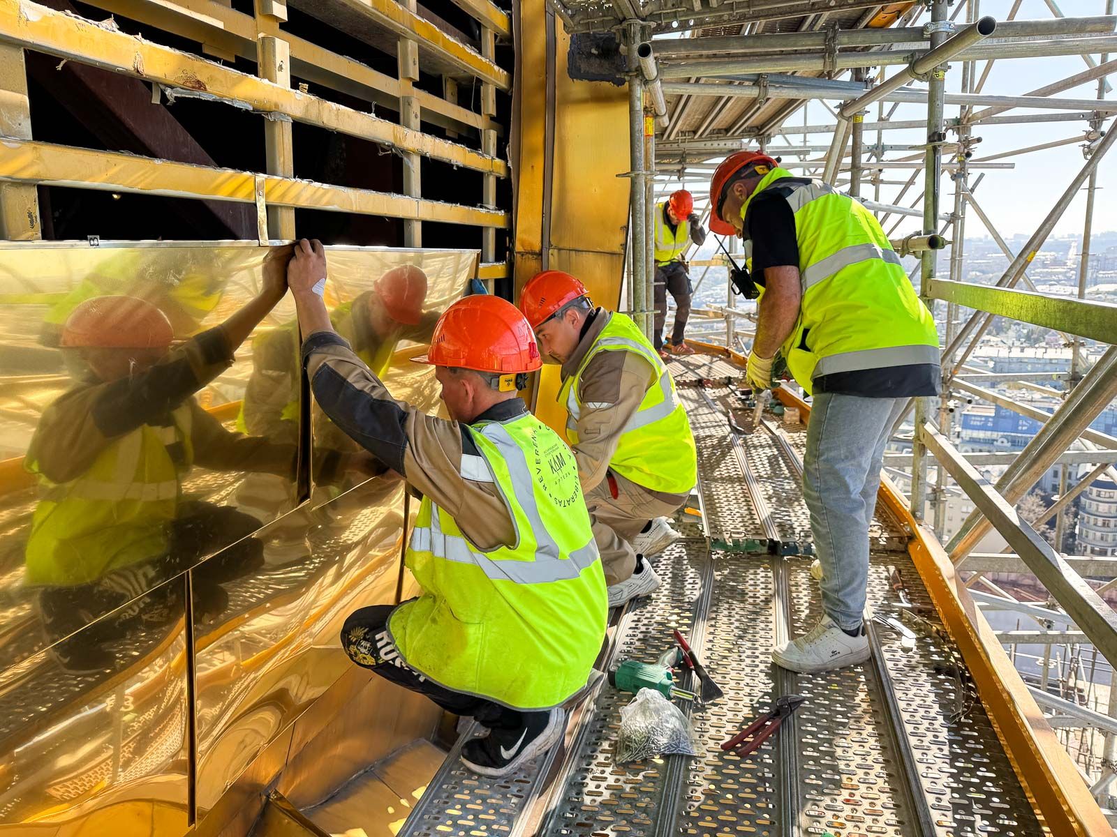 Под каждым снятым фрагментом приводят в порядок металлическую обрешетку и делают гидроизоляцию. Новые листы устанавливают особым замковым способом, который обеспечивает полную герметичность. Общий вес покрытия составит около 15 тонн. Кровельщики трудятся вручную, небольшими бригадами на высоте 80–100 метров. Для выполнения этой уникальной работы задействовали лучших специалистов со всей России.