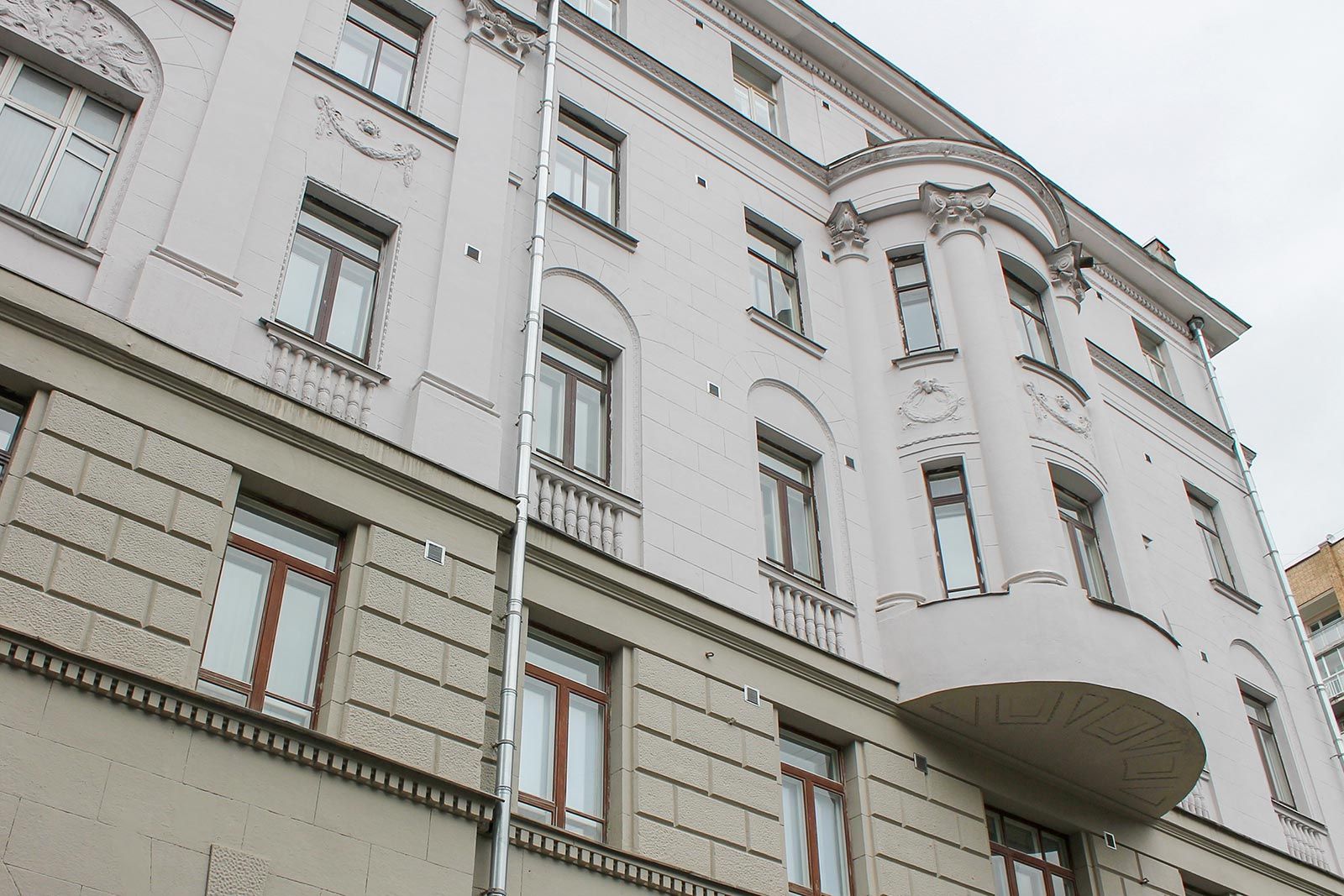 Работы начали с расчистки открытых поверхностей фасадов. В порядок также тщательно привели архитектурные элементы — пилястры и колонны с капителями, сандрики, модульоны под венчающим карнизом и кронштейны под балконами. Места замокания на фасаде обработали антигрибковыми составами, а после всех подготовительных мероприятий здание заново оштукатурили и окрасили, вернув дому его исторические цвета — «коричневый дуб» для нижней рустованной части фасада и «бежевый мел» для основного объема. Кроме того, обновили входы в подъезды и отремонтировали цоколь. На фасаде установили новую систему внешнего водостока, заменили отливы и окна в местах общего пользования на современные стеклопакеты, обновили балконы и отремонтировали откосы.