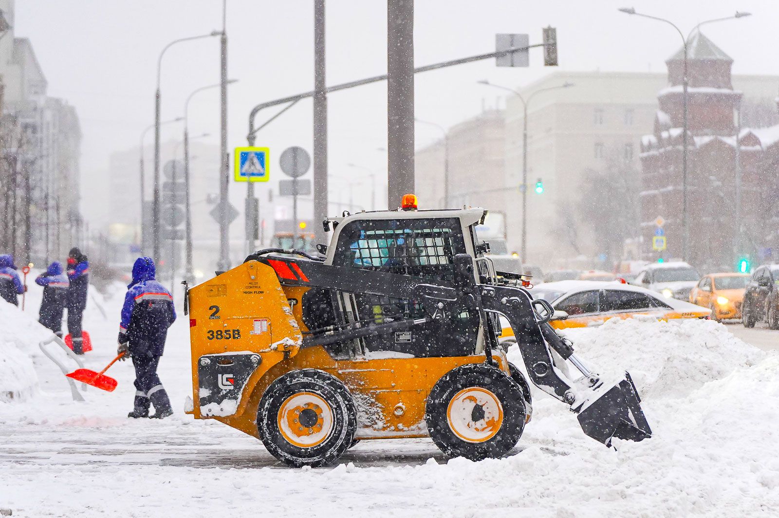 Специалисты вывозят с улиц скопившиеся сугробы, чистят от снега и наледи крыши домов, выступающие элементы фасадов зданий, водосборные желоба и воронки водостоков.