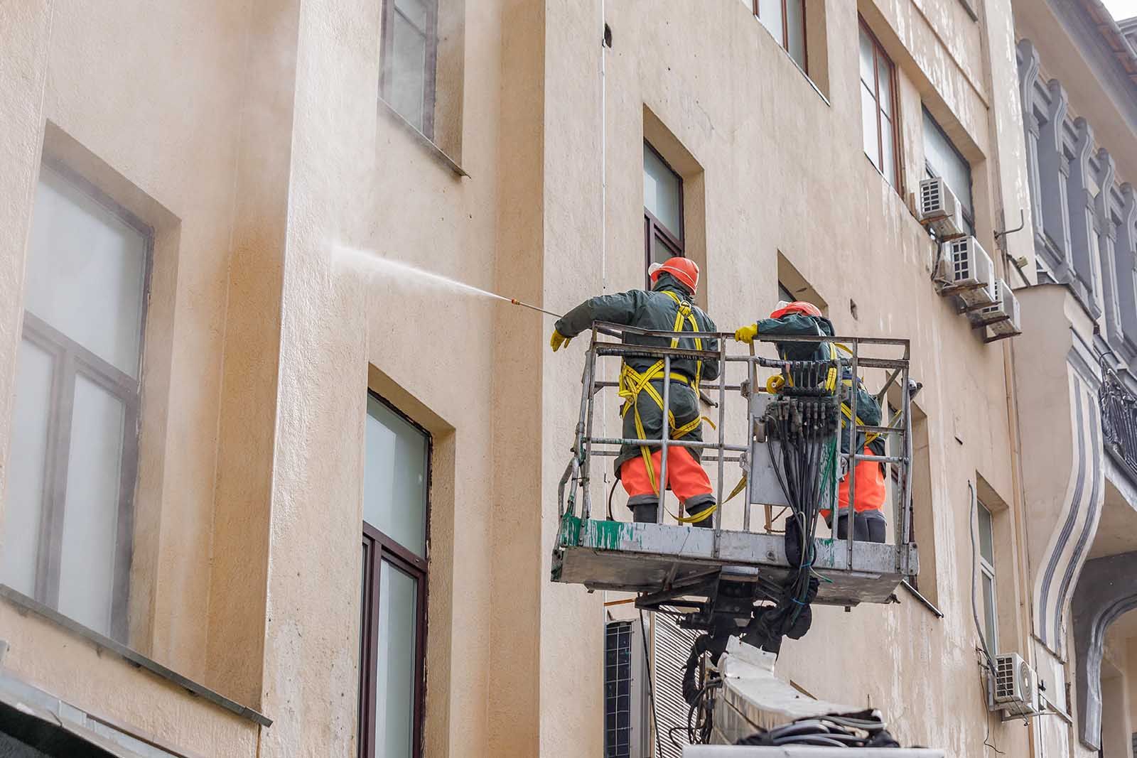 Промывка фасадов проводится с использованием автовышек, аппаратов «Керхер», гидрантов и другой спецтехники. Для очистки высотных зданий привлекаются промышленные альпинисты.