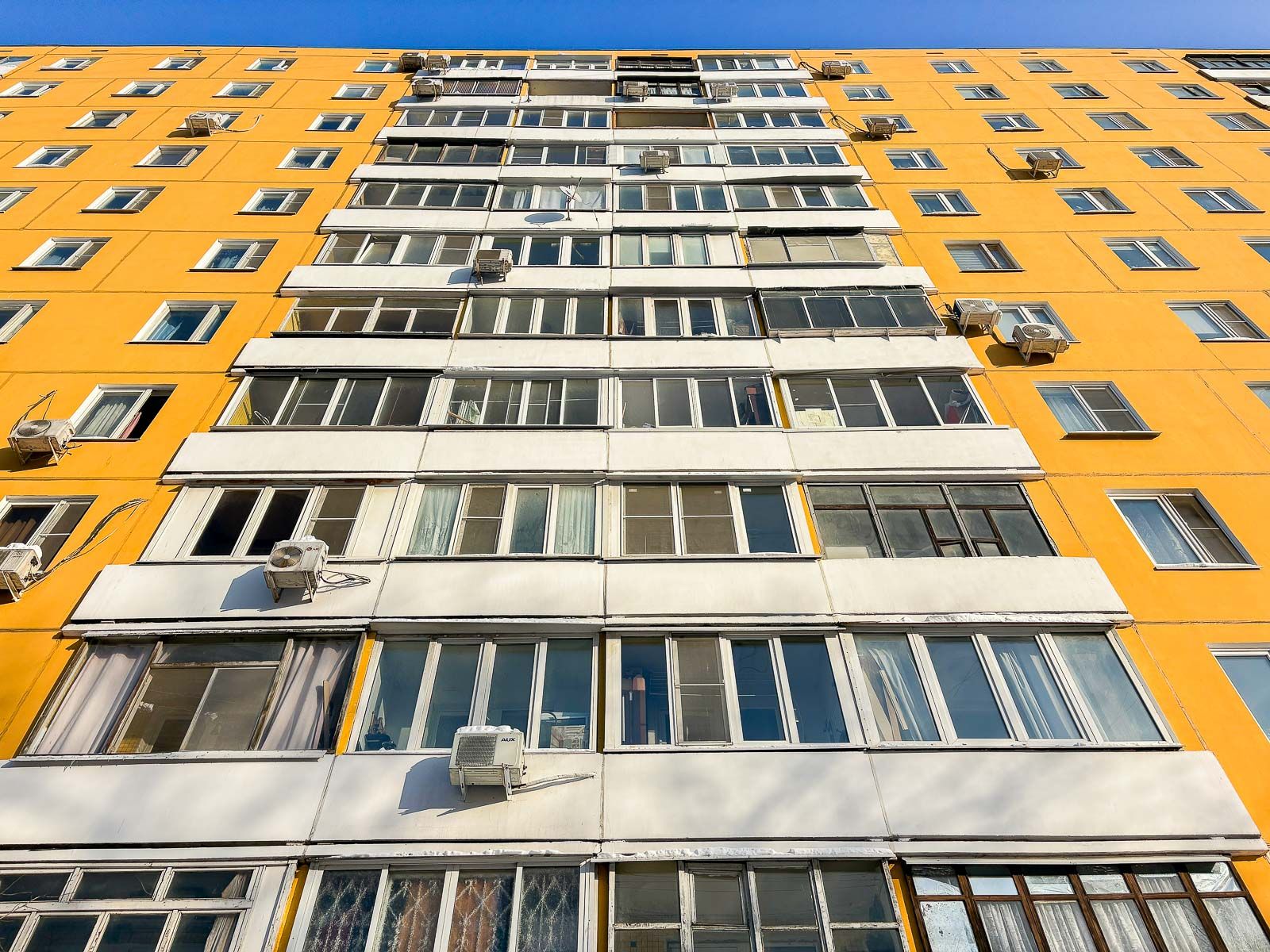 Экраны и фронтальные стены лоджий с ячеистой плиткой восстановили с помощью полимерцементных смесей на армирующих сетках. После завершения всех подготовительных этапов специалисты нанесли штукатурно-окрасочный слой и обработали межпанельные швы двухкомпонентным герметиком. Особого внимания заслуживает новое цветовое решение: некогда серые стены теперь приобрели апельсиновый и цветочно-желтый оттенок.