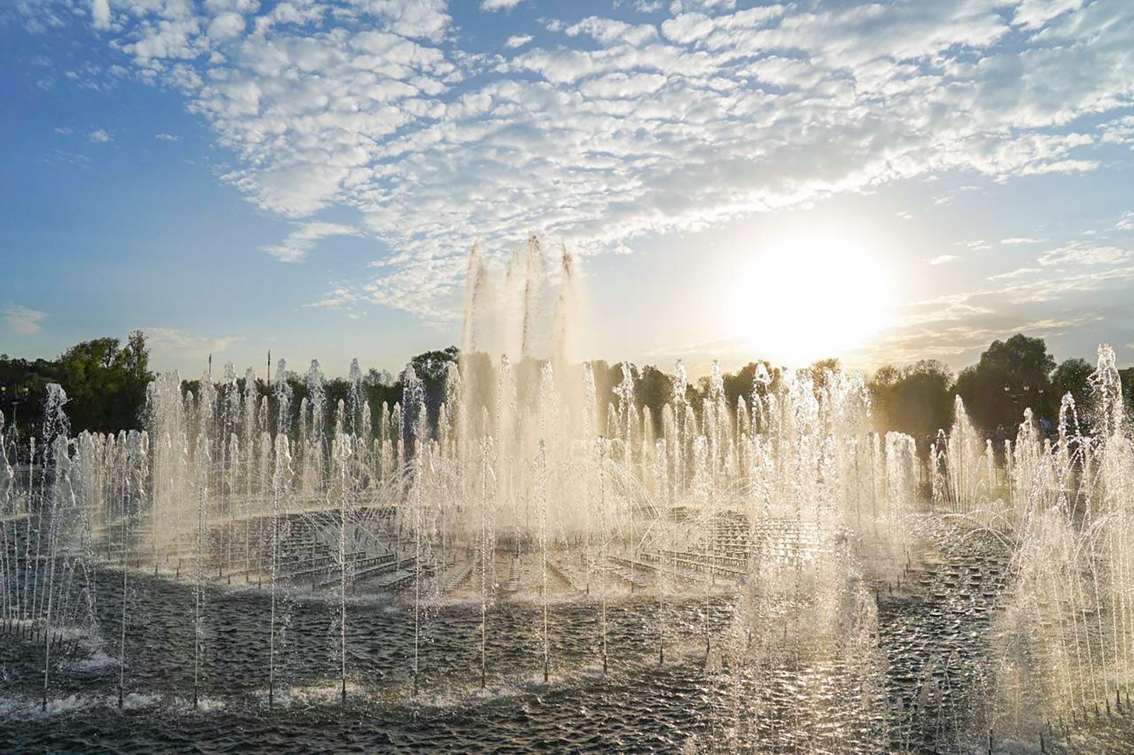 Музыкальный светодинамический фонтан состоит почти из четырех тысяч светильников и более 800 струй. Благодаря работе 82 насосов струи под музыку способны подниматься на высоту до 15 метров.