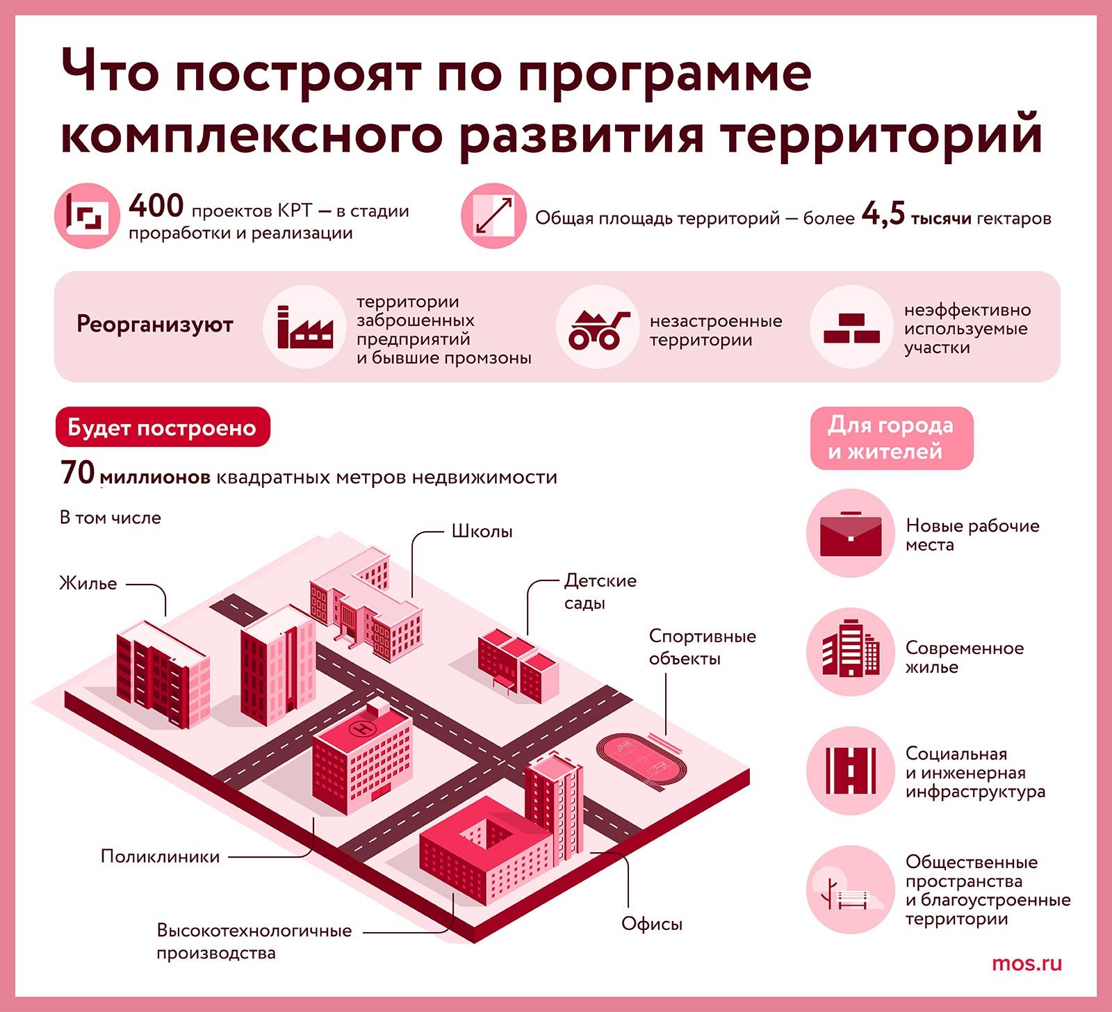 В рамках программы комплексного развития территорий в бывших промзонах, на неэффективно используемых и незастроенных участках формируют привлекательные городские пространства, которые органично интегрируют в общегородскую ткань. В настоящий момент в столице на разных стадиях проработки и реализации находится почти 400 проектов КРТ общей площадью около 4,5 тысячи гектаров. Реализуют программу по поручению Сергея Собянина.