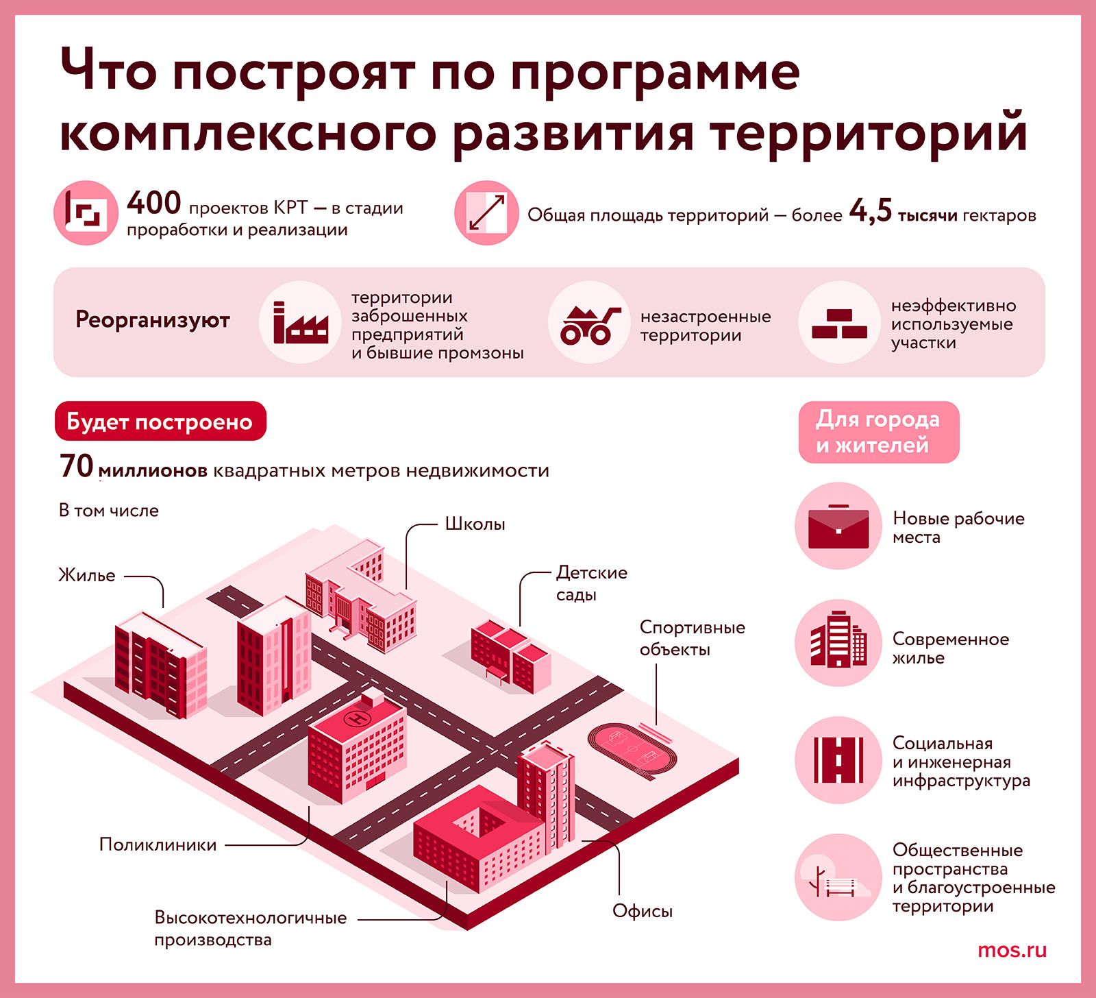 В рамках программы КРТ в Москве на месте бывших промзон, неэффективно используемых и незастроенных участков создаются привлекательные общественные пространства, органично вписанные в общегородскую среду. Сейчас в столице на разных стадиях реализации находится почти 400 проектов КРТ общей площадью около 4,5 тысячи гектаров. Программа реализуется по поручению Сергея Собянина.