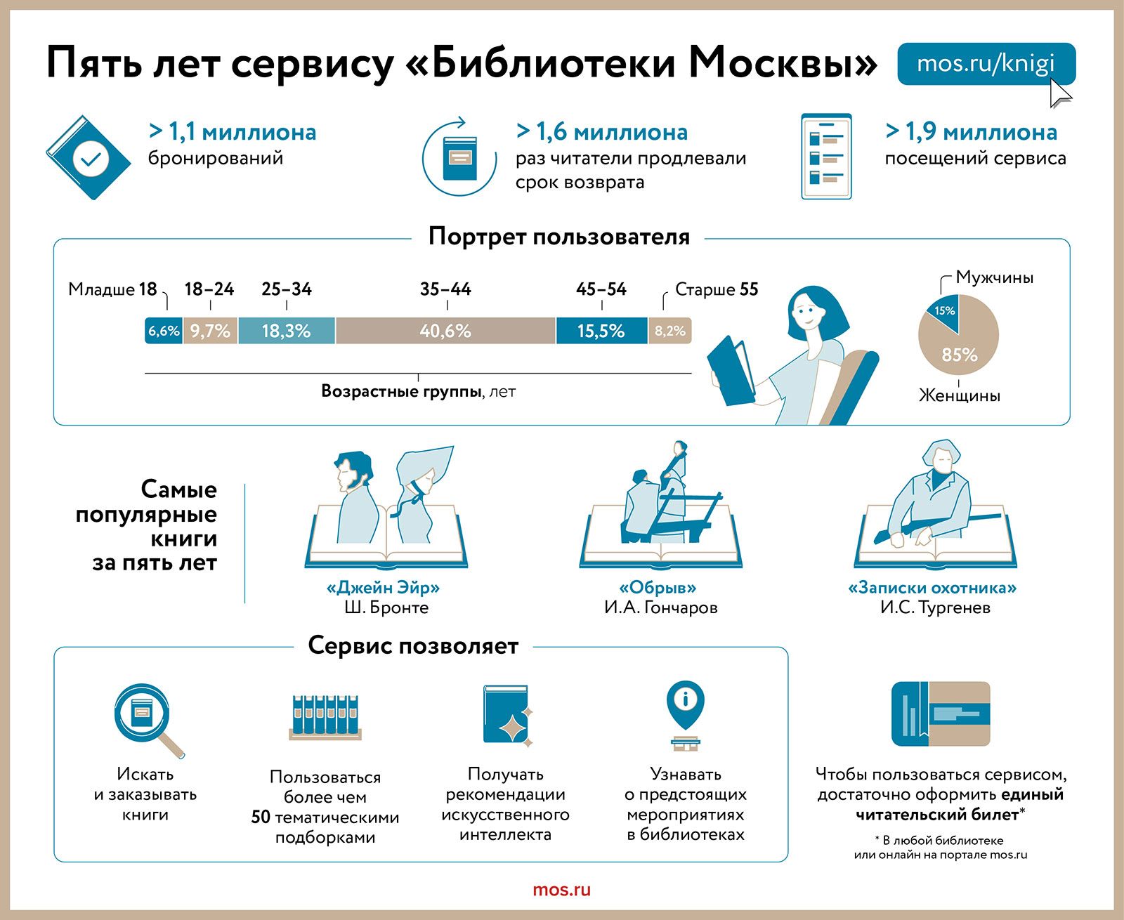 «С помощью сервиса “Библиотеки Москвы” жители города могут искать и заказывать книги, знакомиться с тематическими подборками, получать рекомендации искусственного интеллекта (ИИ) на основе своих предпочтений, а также узнавать о ближайших мероприятиях в библиотеках. Кроме того, у горожан востребована функция продления срока возврата книг: она особенно удобна в путешествии, когда можно легко перенести дату онлайн, не дожидаясь подтверждения от учреждения. За пять лет работы сервиса количество изданий, срок хранения которых читатели продлили дистанционно, составило более 1,6 миллиона», — рассказали в пресс-службе Департамента информационных технологий города Москвы.