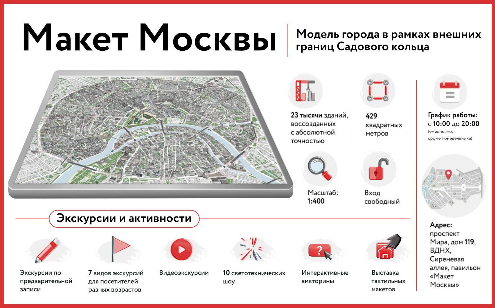 Павильон регулярно принимает организованные группы школьников и студентов со всей страны. Для них проводят обзорные и тематические экскурсии в аудио- и видеоформате. Сегодня доступны семь программ: «Макет Москвы», «Макет Москвы. Детская», «Архитектурные стили и зодчие Москвы», «Пушкинская Москва», «Москва театральная», «Храмы Москвы» и «Москва в кино». Мультимедийный формат делает площадку практико-ориентированной образовательной средой для изучения истории, архитектуры и градостроительного развития столицы. Здесь также есть камеры с 40-кратным увеличением, информационные киоски, многоуровневая светотехническая и звуковая системы.
