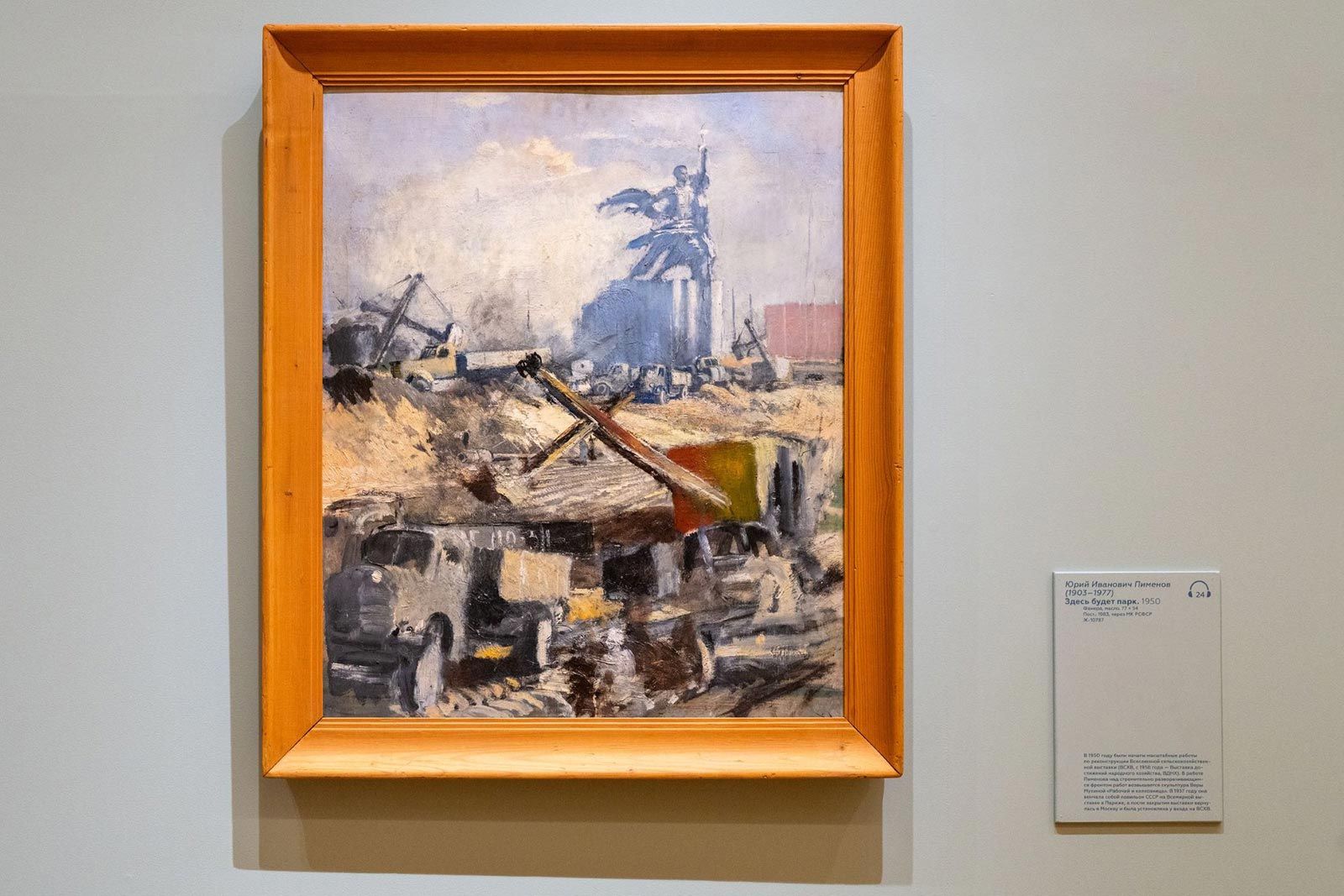 Самая важная для ВДНХ картина Юрия Пименова — «Здесь будет парк», написанная в 1950 году. Тогда началось строительство обновленной Всесоюзной сельскохозяйственной выставки (ВСХВ), послевоенное открытие которой произошло в 1954 году. Перед входом уже стоит вернувшаяся с международной выставки в Париже монументальная скульптура «Рабочий и колхозница», а за ней кипит работа — формируется территория современной ВДНХ.