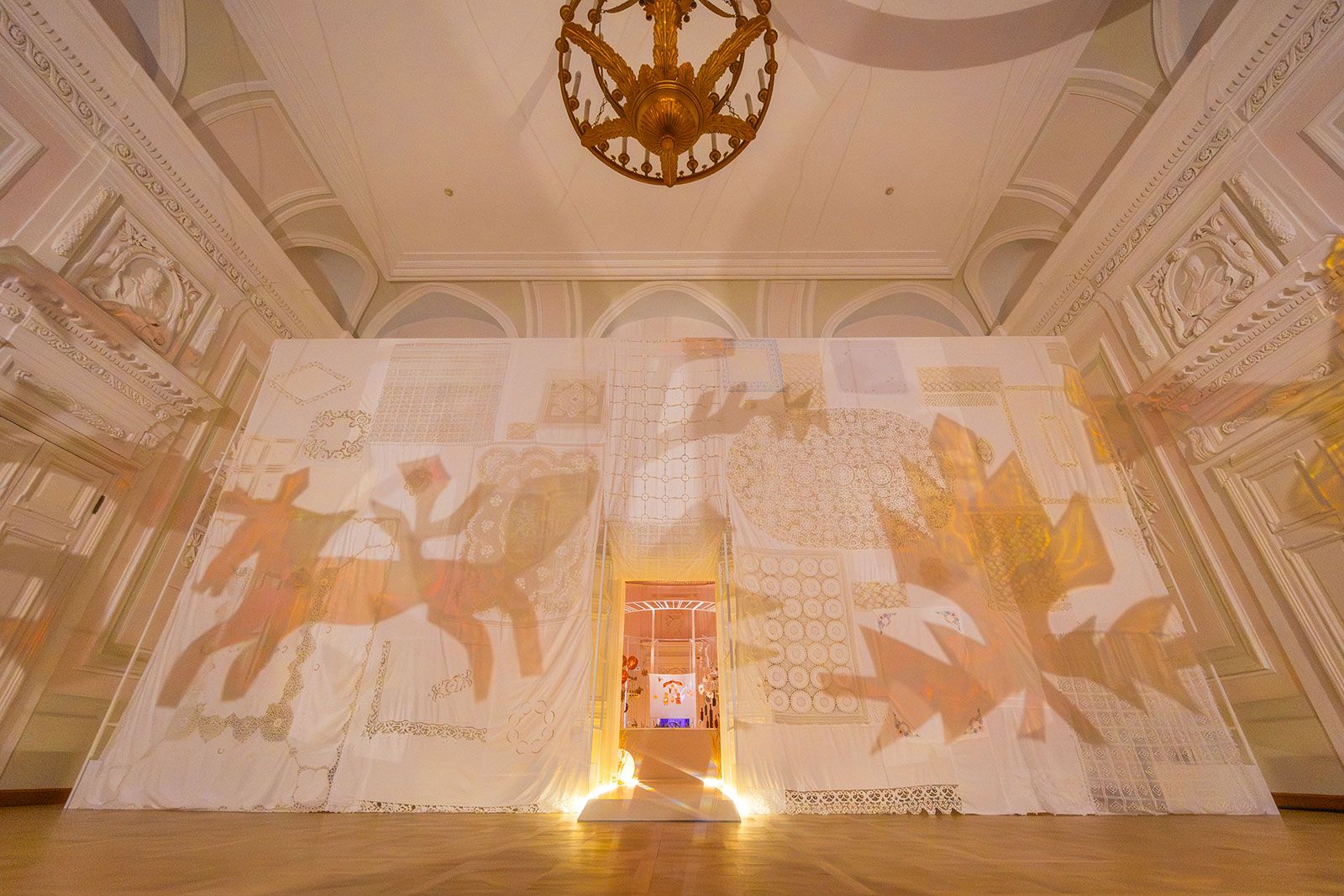 «Первый зал — это эмоциональный вход в пространство. Нам очень важно ввести зрителей в некое медитативное состояние. Это идея художника инсталляции Александра Шарапова, что полотно должно быть сшито из кусков семейных кружев. То есть здесь есть и что-то от самого Александра — кружева 1950-х годов. Здесь вручную связанные салфетки, буквально кусочки, которые мы помним, которые имеют к нам отношение», — объясняет Диана Сарычева, креативный директор «РУниверсума».