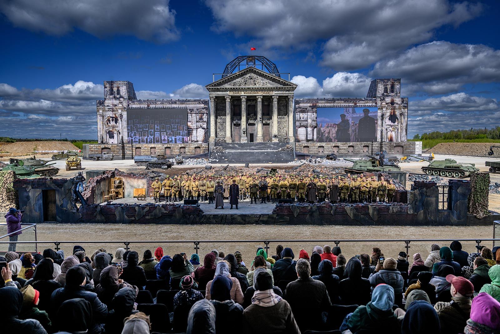 Одним из самых крупных мероприятий станет премьера телевизионной версии иммерсивной постановки Игоря Угольникова «Победа! Знамя над Рейхстагом!» в многофункциональном зале кинопарка «Москино». Она состоится 6 и 7 декабря. Впервые зрители увидели постановку к 80-летию победы в Великой Отечественной войне на майские праздники. Ее представили на площадке «Рубежи обороны» кинопарка. В ней приняли участие около 400 человек, в том числе заслуженный артист России Сергей Маховиков, актеры Алексей Колган и Сергей Селин. Сценарий основан на исторических документах, а большинство персонажей — реальные исторические лица — от маршала Георгия Жукова до простых солдат и сержантов, участвовавших в битве за Берлин. Всего за девять дней постановку посмотрели более семи тысяч человек.