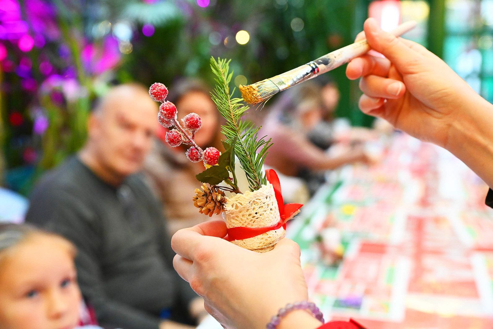 В сквере по Олонецкому проезду юные москвичи и гости столицы под руководством педагогов расписывают керамические и деревянные елочные игрушки в виде конфеты, часов, колокольчиков, карусели и котенка по имени Гав из серии советских мультфильмов. На занятиях дети учатся рисовать узоры, вдохновленные новогодними мотивами, сказкой «Морозко» или московской архитектурой.