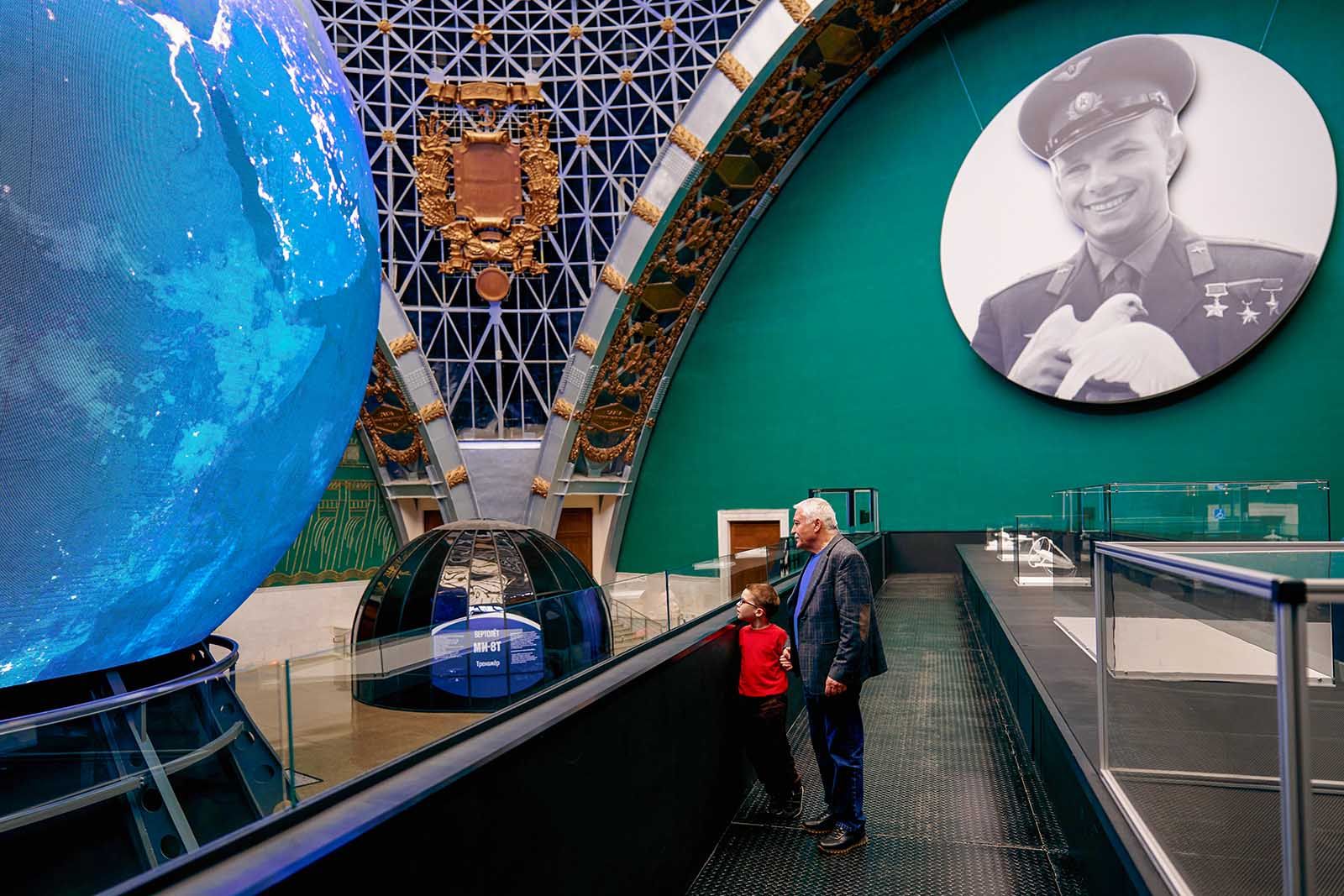 Путешествие отца и сына проходит на ВДНХ и начинается с павильона № 34 «Космос», в котором находится центр «Космонавтика и авиация». Здесь их встречает знаменитый фотопортрет улыбающегося Юрия Гагарина с белой голубкой в руках. Он расположен на круглом панно в подкупольной части здания. Не заметить этот трогательный черно-белый снимок практически невозможно — диаметр панно составляет 10 метров. Фото сделали меньше чем через месяц после возвращения первого космонавта на Землю. Журналист газеты «Комсомольская правда» Павел Барашев запечатлел момент 25 мая 1961 года. В то время Юрий Гагарин путешествовал по разным странам с миссией мира. В Болгарии местный пионер вручил ему голубя. Этот миг и попал на пленку. Фотография обрела популярность во всем мире, ее копия есть даже на Международной космической станции. А на главной выставке страны портрет находился с 1983-го до середины 2010-х годов. На время его демонтировали, и в 2021 году (в честь 60-летия полета Гагарина) экспонат вернули на историческое место. Юрий Гагарин неоднократно посещал ВДНХ, а в павильоне № 34 побывал в ноябре 1965 года.