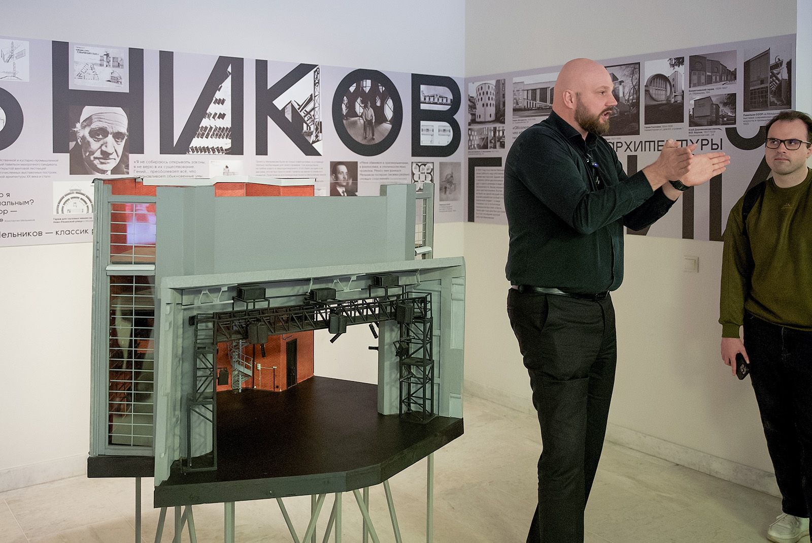 «Здесь нет ни одного места ниже уровня сцены, — объясняет Руслан Ситников, проводя гостей по залу. — В этом заключается одна из метафор Мельникова: у всех зрителей есть выбор, как воспринять услышанное. Вы все равно сверху. А когда вы поднимаетесь на балкон, вы вообще задаетесь вопросом: что должен сделать актер на сцене, чтобы вы отнеслись к нему как к авторитету? Потому что зритель оказывается в позиции наблюдателя и аналитика».