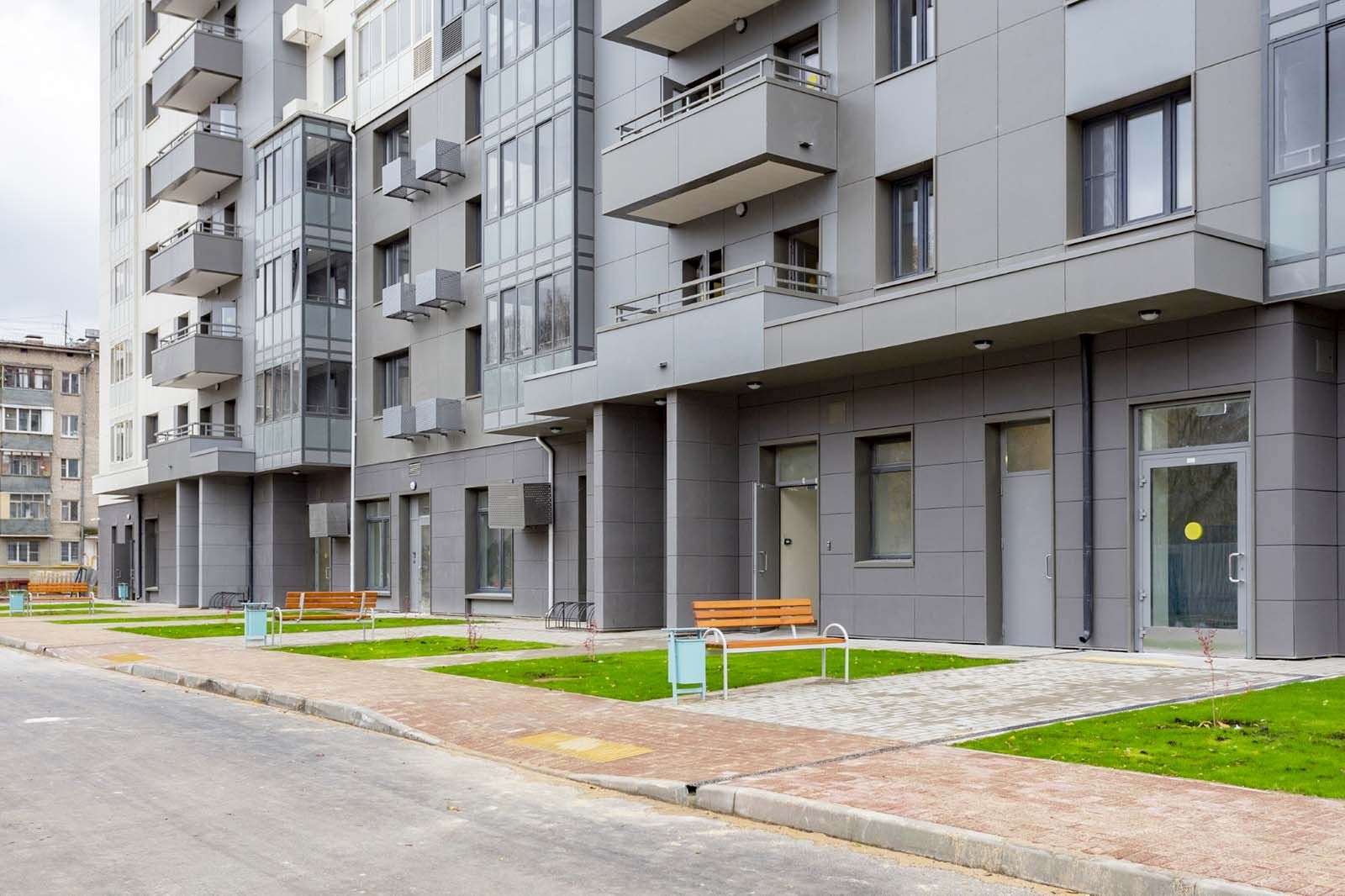 Во дворе новостройки выполнили комплексное озеленение и благоустройство, оборудовали детскую и спортивную площадки, а также место для спокойного отдыха.