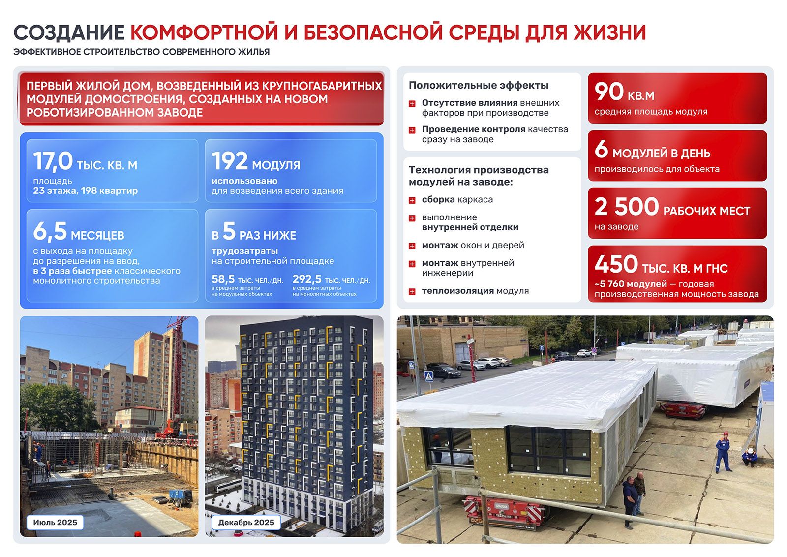 В конце 2025 года в Черемушках (улица Гарибальди, дом 31) был сдан первый дом по программе реновации, построенный из крупных модулей всего за 6,5 месяца — это в среднем в три раза быстрее стандартного монолитного строительства. Модули производят на роботизированном заводе, расположенном в ТиНАО.