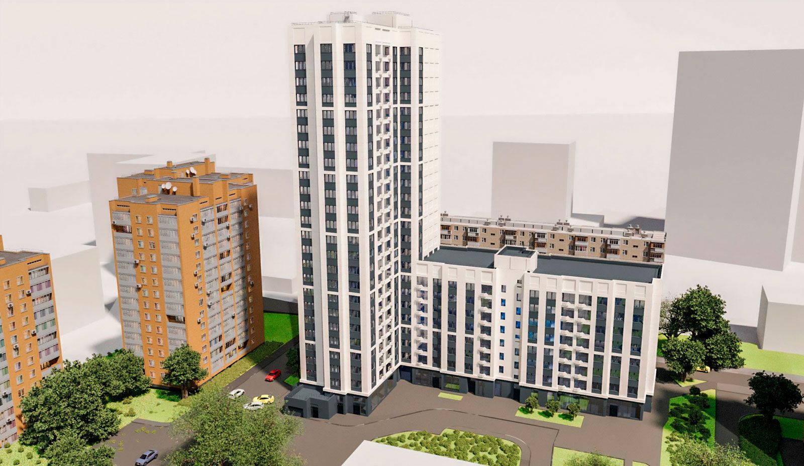 Придомовая территория комплексно обустроена — зеленые насаждения, уличные фонари, удобные тротуары делают двор уютным и безопасным. Во дворе оборудованы детские и спортивные площадки. Для автомобилей предусмотрены проезжие и парковочные зоны, расположенные отдельно от мест для прогулок.