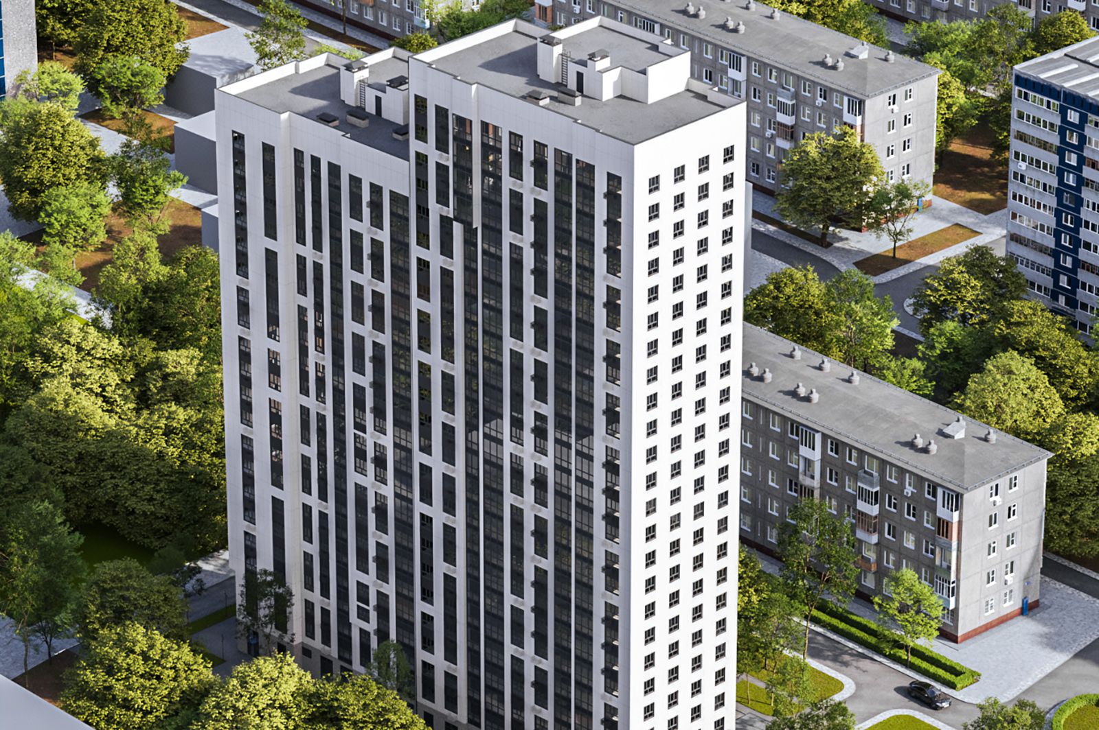 Первый этаж новостройки занимают колясочные, комнаты для консьержей и нежилые помещения, где смогут открыться различные объекты инфраструктуры — от магазинов до образовательных центров. На подземном уровне расположена автомобильная парковка, попасть на которую можно с любого этажа с помощью больших лифтов.