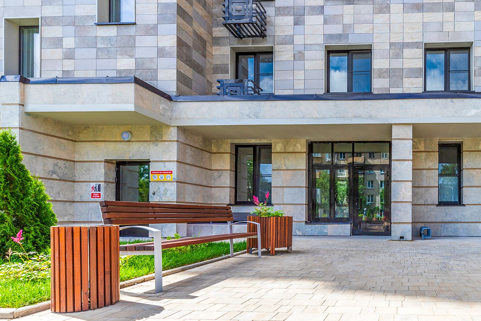 Возле дома благоустроят территорию площадью около 3,2 тысячи квадратных метров. Здесь заасфальтируют проезды и тротуары, уложат газон, высадят кустарники и деревья. Во дворе предусмотрены места для отдыха с лавочками, детская и спортивная площадки с прорезиненным покрытием.