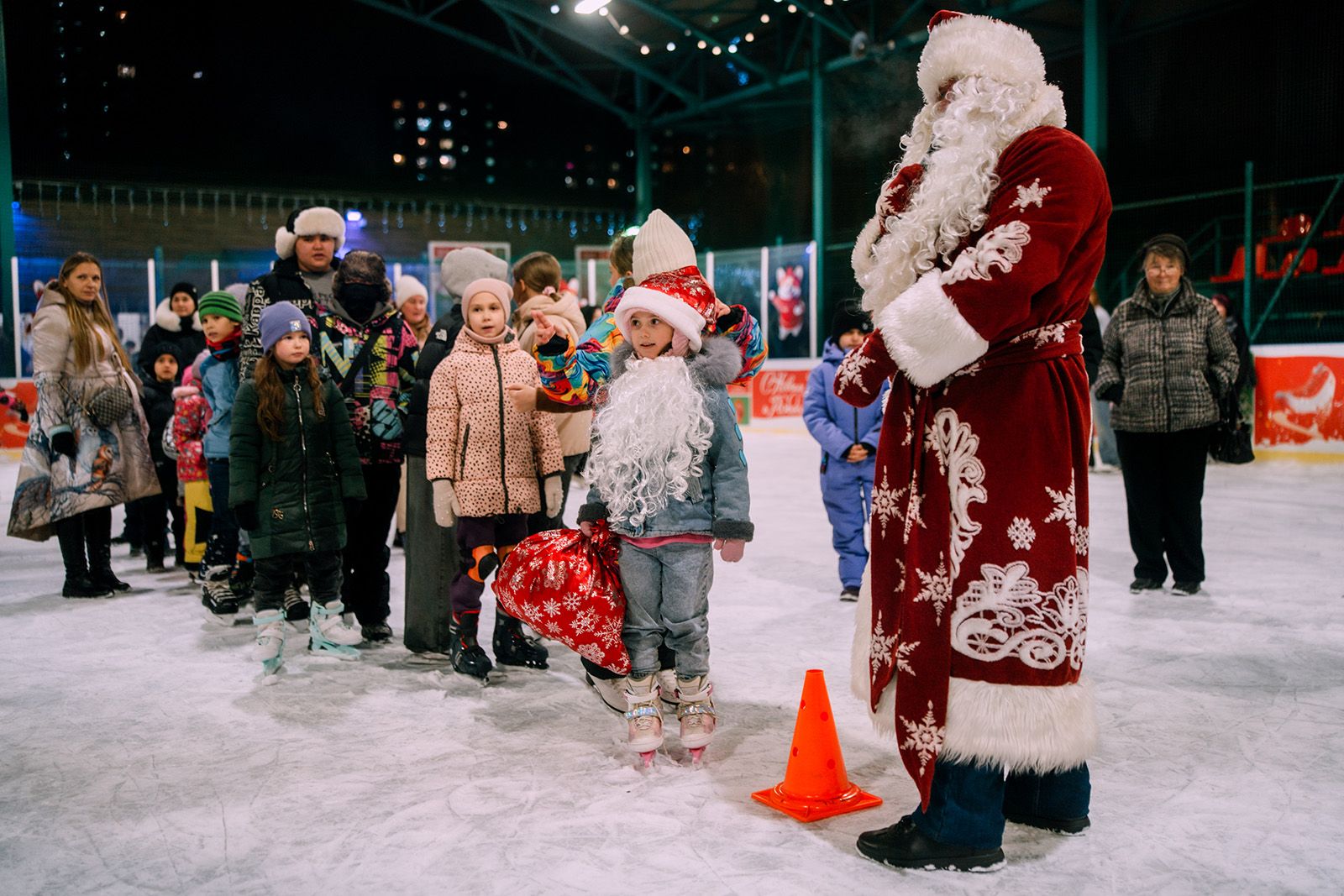 Дети приняли активное участие в театрализованном музыкальном представлении с Дедом Морозом, Снегурочкой и персонажами русских народных сказок. Для них приготовили задания в игровой форме. Например, нужно было сбить кегли лаптем, поймать снежки импровизированным неводом, скатать Колобка — главного героя одноименной сказки, собрать колодезную воду коромыслом и разгадать загадки Бабы-яги.