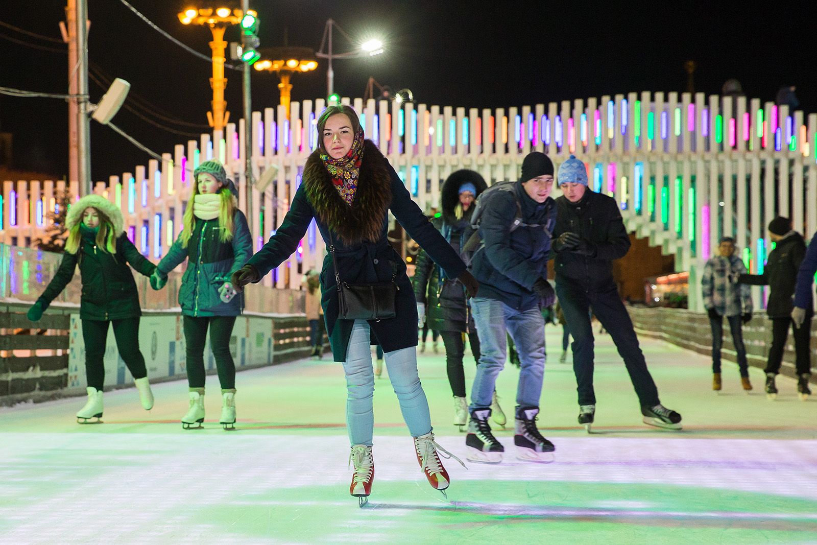 На катке на Болотной площади выступят выпускники творческого лагеря «Молодежь Москвы» и бенд «НЧБ». Посетителей также пригласят присоединиться к праздничному хороводу.