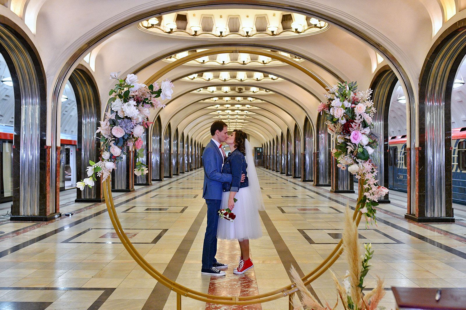 Церемонии на станции метро «Маяковская» стали особенно популярны благодаря уникальному сочетанию исторической атмосферы и современных решений. Специально для регистрации брака станцию украшают свадебным декором. На путях церемонии бракосочетания сопровождают два состава: «Москва-2020» и «Москва-2024».