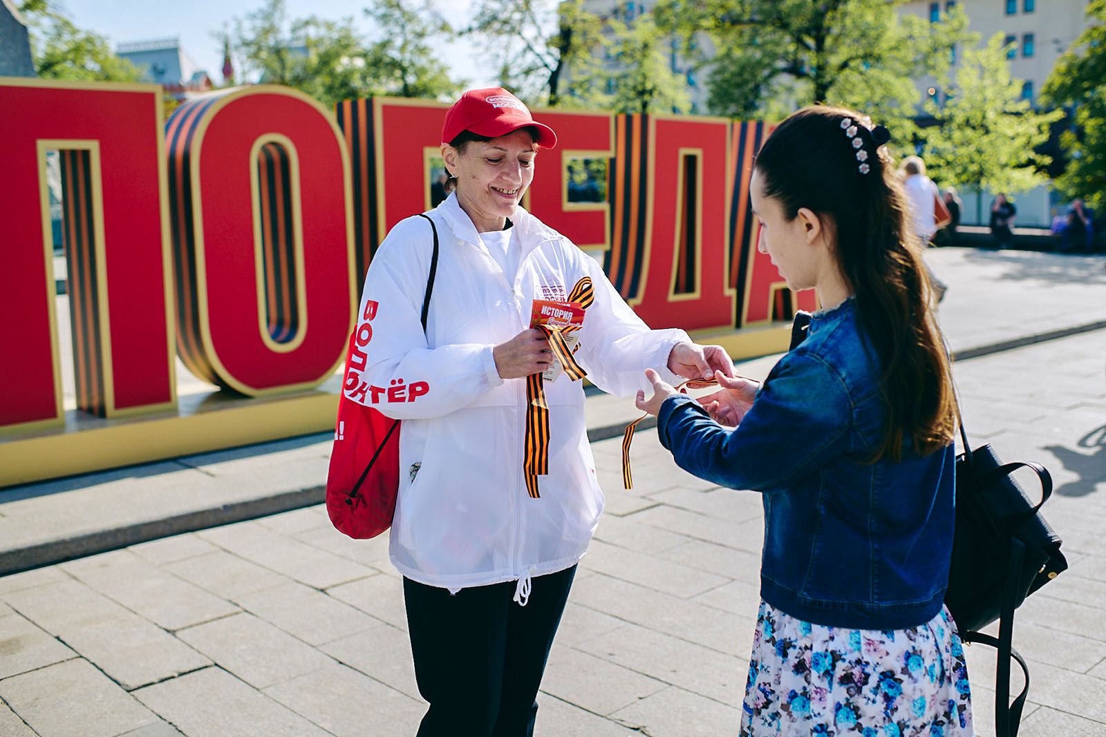 Волонтеры поздравляли ветеранов, дарили жителям и гостям столицы георгиевские ленты. Они раздавали письма-треугольники с историями о героях и приводили в порядок мемориалы.
