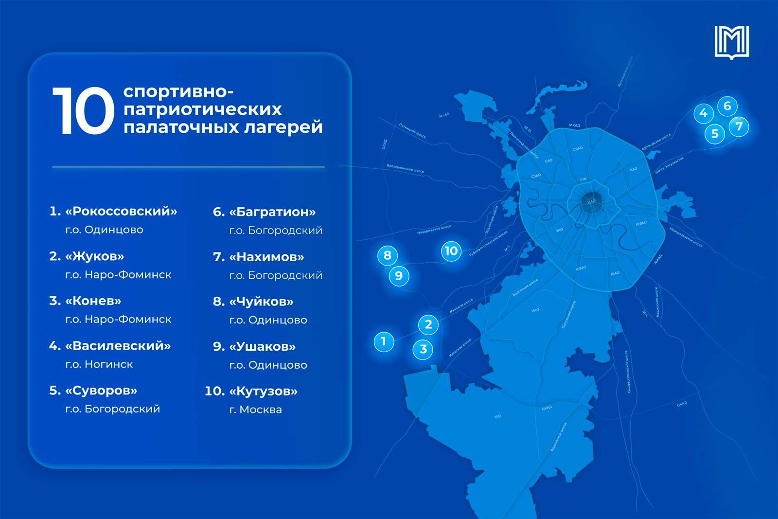 Каждый лагерь назвали в честь выдающегося маршала или полководца. В Алабине разместят лагеря «Жуков» и «Конев», на территории парка «Патриот» — «Рокоссовский», на базе центра МЧС в Ногинске — «Василевский», на территории Московского высшего общевойскового командного училища — «Суворов», «Багратион» и «Нахимов», в Звенигороде — «Чуйков» и «Ушаков», а в Одинцовском городском округе Московской области — «Кутузов».