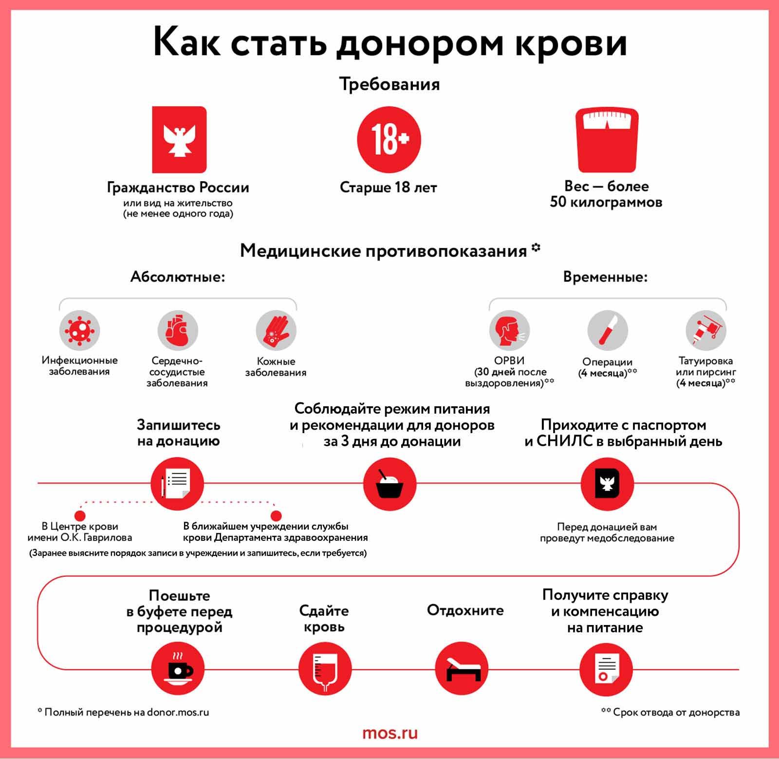 Стать донором может практически любой здоровый человек старше 18 лет, чей вес составляет минимум 50 килограммов. Волонтеры не должны иметь медицинских противопоказаний, как постоянных, так и временных, о которых можно узнать на сайте выбранного отделения переливания крови или на консультации со специалистом перед процедурой. Принять участие в донации москвичи могут вместе с ресурсным центром «Мосволонтер» во время проведения специальных акций, а также посетив ближайшее отделение переливания крови. Записаться на процедуру лучше заранее. Приходить на сдачу крови нужно только при хорошем самочувствии.