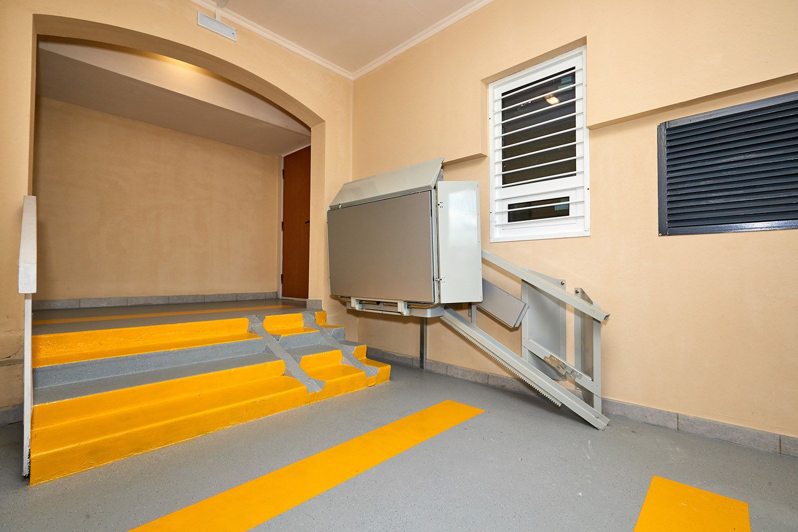 Если позволяют технические условия и в подъезде есть большой холл, то приоритет отдают вертикальным подъемным платформам. Это мини-лифты, которые преодолевают расстояние до четырех метров. При отсутствии такой возможности оборудуют подъемник наклонного типа. Компактную конструкцию монтируют на стойках вдоль стены параллельно лестничному маршу, в сложенном виде она не мешает проходу.