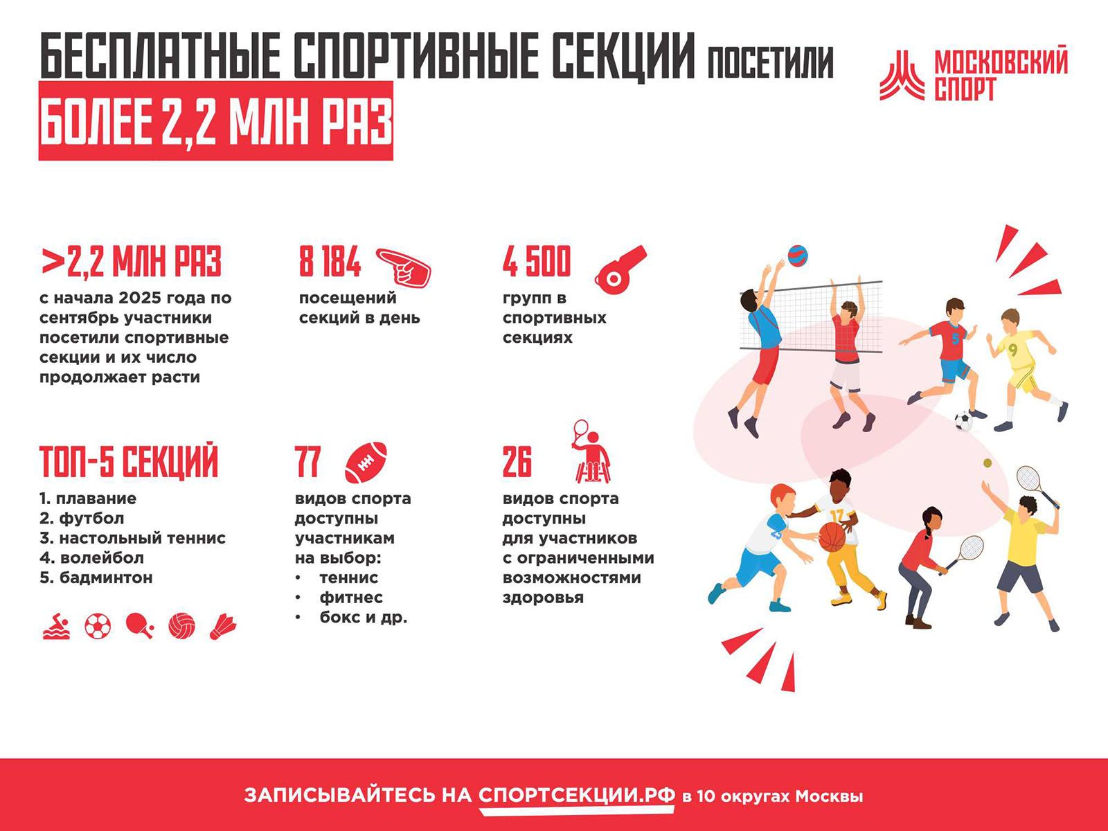 В столице открыты бесплатные спортивные секции для детей и взрослых. С января по сентябрь жители 10 административных округов города посетили тренировки в них более 2,2 миллиона раз.