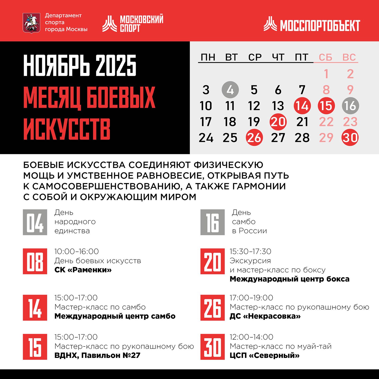 Тематический месяц откроет день боевых искусств, который состоится 8 ноября с 10:00 до 16:00 в спортивном комплексе «Раменки» на улице Раменки (дом 19, строение 1). 14 ноября с 15:00 до 17:00 в Международном центре самбо в Новолужнецком проезде (дом 13) пройдет мастер-класс по самбо для детей в возрасте от 12 до 16 лет, а 15 ноября с 15:00 до 17:00 в павильоне № 27 на ВДНХ на проспекте Мира (дом 119, строение 27) — занятие по рукопашному бою для всех желающих от 15 до 55 лет. Кроме того, поклонников этого вида единоборств в возрасте шести — 11 лет ждут 26 ноября с 17:00 до 19:00 во Дворце спорта «Некрасовка» на Покровской улице (дом 22). А 30 ноября с 12:00 до 14:00 в центре современного пятиборья «Северный» на улице Арсюкова (дом 11) ждет муайтай — мастер-класс организуют для участников от 12 до 17 лет.