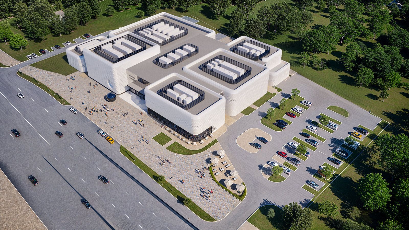 Для отделки фасадов будущего дворца бильярда используют белые кассеты. Чтобы почеркнуть входные группы, применят остекление, контрастирующее с более закрытыми основными блоками здания.