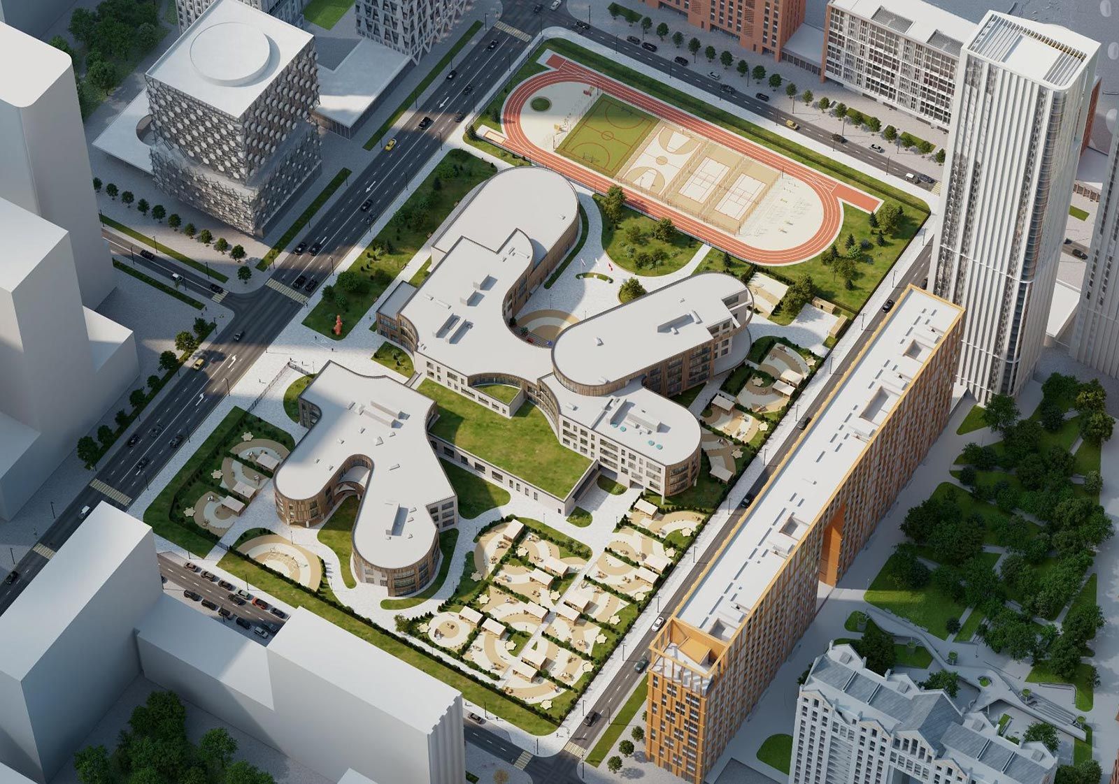 Школьный блок будет переменной этажности, со специализированными и универсальными учебными кабинетами, а также с двумя спортивными залами. Его центральным элементом станет многосветное многофункциональное пространство с медиатекой и обеденным залом.