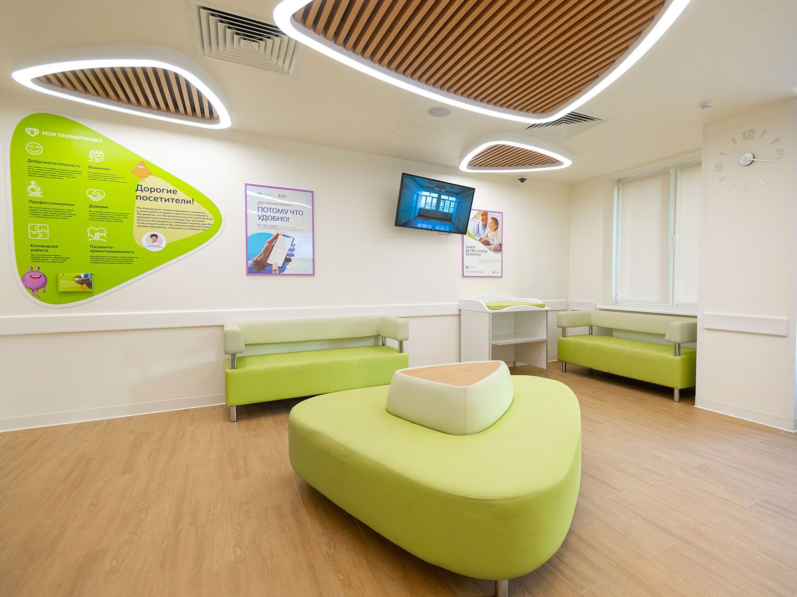 На первом этаже поликлиники планируют разместить кабинеты дежурного врача, зоны приема анализов, реабилитации, выдачи справок и направлений. Кроме того, для посетителей будет работать буфет, а для мам и малышей появится молочно-раздаточный пункт.