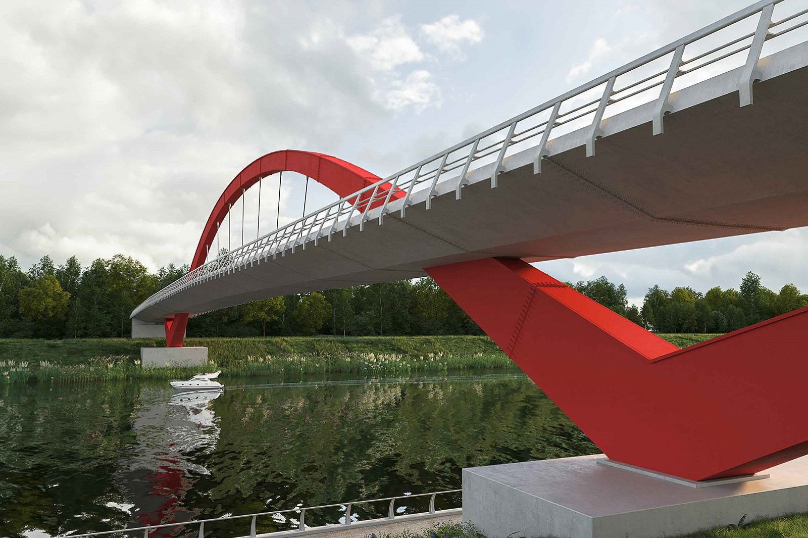 Сооружение протяженностью около 200 метров и шириной почти 12 метров выполнят в серой цветовой гамме с красными конструктивными акцентами. Оно будет эстетически перекликаться с построенным рядом Гагаринским мостом, арки которого также имеют алый цвет.