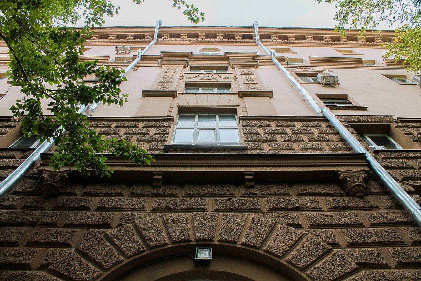 Специалисты привели в порядок арки, порталы входных групп, восстановили венчающий карниз и кронштейны балконов, затем окрасили в цвета «светло-желтая пшеница» и «светло-коричневый ясень».