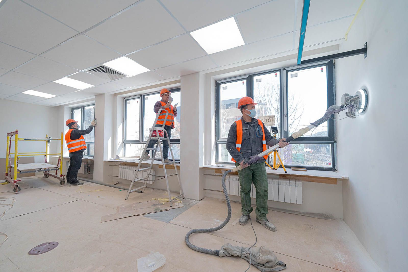 Сейчас специалисты ведут монтаж внутренних инженерных сетей. Полностью меняют системы электроснабжения, вентиляции и кондиционирования, водоснабжения и водоотведения, а также слаботочные сети. Вместо чугунных батарей устанавливают энергоэффективные радиаторы с возможностью регулировки температуры в помещении. В кабинетах прокладывают современную вентиляцию, новые слаботочные сети для систем пожарной безопасности, видеонаблюдения, контроля и управления доступом, а также оснащают помещения проводным интернетом и вайфаем. Помимо этого, устанавливают межкомнатные двери со стеклянными элементами и выполняют чистовую отделку.