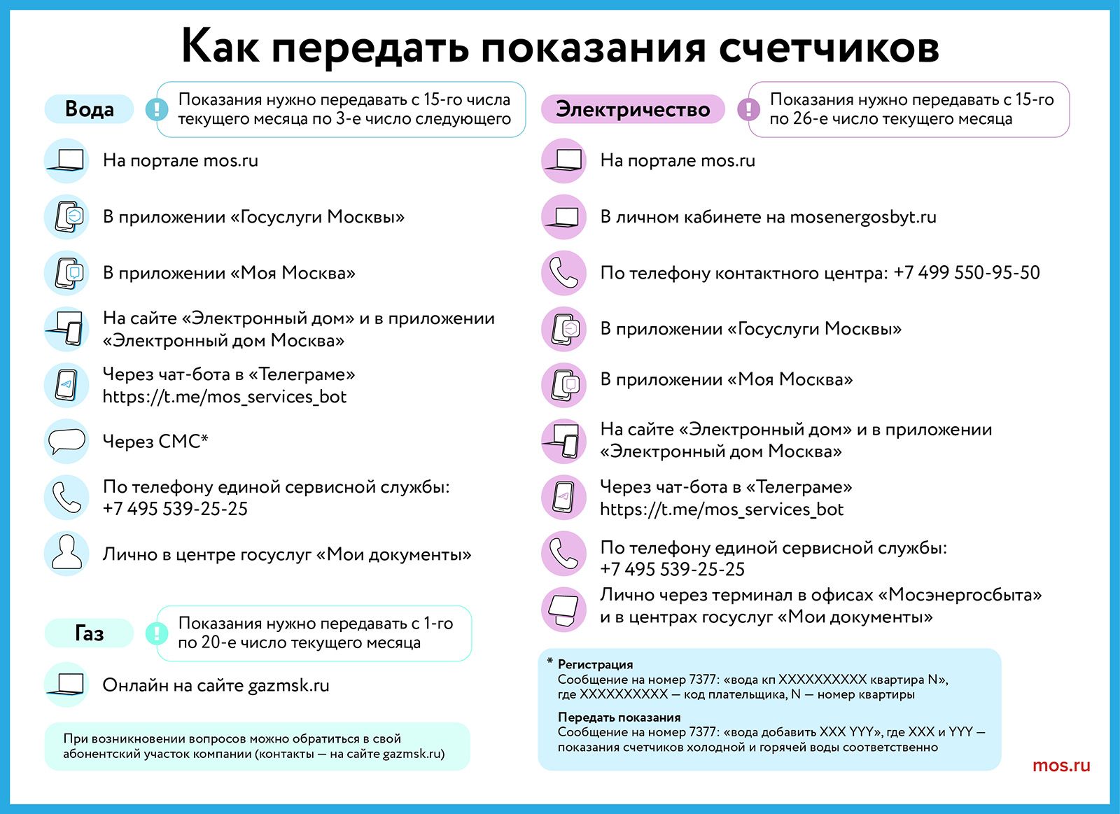 Передать показания счетчика электроэнергии можно и при помощи виджета «Коммунальные услуги» в личном кабинете портала mos.ru, в городских мобильных приложениях «Моя Москва» и «Госуслуги Москвы», на сайте и в мобильном приложении платформы «Электронный дом», а также по телефону горячей линии единой сервисной службы: +7 495 539-25-25.